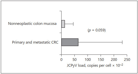 Results: JCPyV LT-Ag sequences were detected in 18.6% of the CRC tissues and in 15.5% of the nonneoplastic control group. Viral LT-Ag was quantified in 18/100 primary colon adenocarcinomas, 2/10 metastatic adenocarcinomas, and 1/3 primary adenocarcinomas of the rectum. Two JCPyV-positive metastatic tumors presented a negative test result for JCPyV in the corresponding primary tumor. The median JCPyV LT-Ag copy number was 64 × 10–2 per cell and 14 × 10–2 per cell in the CRC cases and the nonneoplastic samples, respectively. There was no statistically significant difference between the two study groups regarding median LT-Ag DNA load (p = 0.059). Among the JCPyV-positive samples, the LT-Ag DNA load was higher in 2 metastatic tumors (from a patient with lung metastasis: 232 × 10–2 copies per cell; from a patient with liver metastasis: 121 × 10–2 copies per cell).