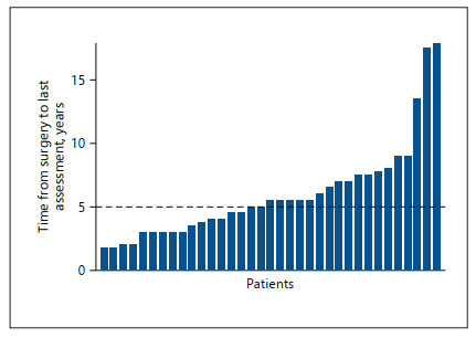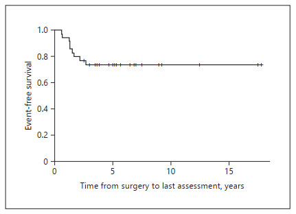 Results: Of the entire cohort, 26 subjects have no evidence of disease (NED), a median of 5.5 years from surgery. Kaplan-Meier analyses indicated a 5-year EFS rate of 74% (95% CI: 60–90%). Eighteen of these 26 patients received capecitabine ≥30 months. Eight of the 17 subjects treated with capecitabine therapy for <30 months developed progressive disease; the majority of the relapses occurred within 20 months of surgery. The difference between the two groups was statistically significant. Six subjects died, only two of who had metastatic disease at the time of death; the other four had NED at least 4 years from surgery. Five patients with resected stage 4 disease who received capecitabine as maintenance therapy were alive >5 years from surgery.