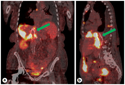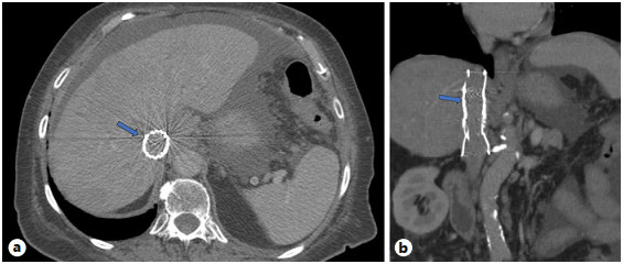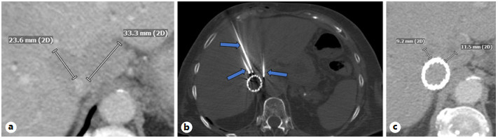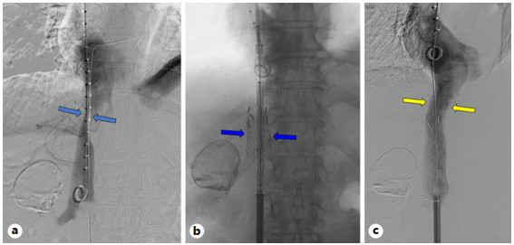 Abstract: Small bowel-origin carcinoid tumor is indolent but may metastasize relentlessly to various sites, including the liver. Over the past 9 years, we have treated a 69-year-old woman who has undergone 5 percutaneous liver ablations, 5 hepatic intra-arterial chemoembolizations, an ovarian cryoablation, and a trans-ventral hernia mesenteric cryoablation. These interventions are all related to her inoperable carcinoid malignancy. After the patient presented with swelling of the abdomen and both lower extremities, computed tomography (CT) angiography was performed, revealing a circumferential hepatic metastatic mass encasing the intrahepatic inferior vena cava (IVC) and extensive third spacing of fluids specific to the IVC distribution below the diaphragm. A venogram of the intrahepatic IVC revealed extrinsic compression causing 95% narrowing of the vessel. A balloon was advanced to the level of the lesion and inflated, increasing the caliber of the vessel. Subsequently, 2 covered aortic stent graft cuffs were deployed in an overlapping fashion within the lumen of the IVC, traversing the area of narrowing. Next, an open-cell aortic dissection stent was placed across both overlapping aortic stents from the renal veins to the hepatic veins. Following this, three 17-gauge cryoablation probes were inserted into the segment 1 intrahepatic lesions encasing the newly stented IVC via an anterior percutaneous approach. Two 10-min freeze cycles were performed with intraoperative CT imaging, demonstrating circumferential coverage of the lesions. Posttreatment venogram revealed patent stent grafts within the intrahepatic IVC, and restoration of vessel patency. No immediate postoperative complications were noted. The patient’s abdominal and lower extremity swelling resolved completely within 1 week after procedure. Two-month follow-up CT demonstrated markedly decreased size of the metastatic lesions and no adverse effects. Six- and 9-month PET-CT scans demonstrated maintained patency of the IVC stent. This palliative procedure allowed the patient to maintain good performance status and alleviated her symptoms of IVC syndrome. The radial force generated by the multiple aortic stents will ostensibly maintain the patency of the intrahepatic IVC. Cryoablation of the encasing metastatic lesion was performed with markedly decreased size of the tumor on the 2-month follow-up.