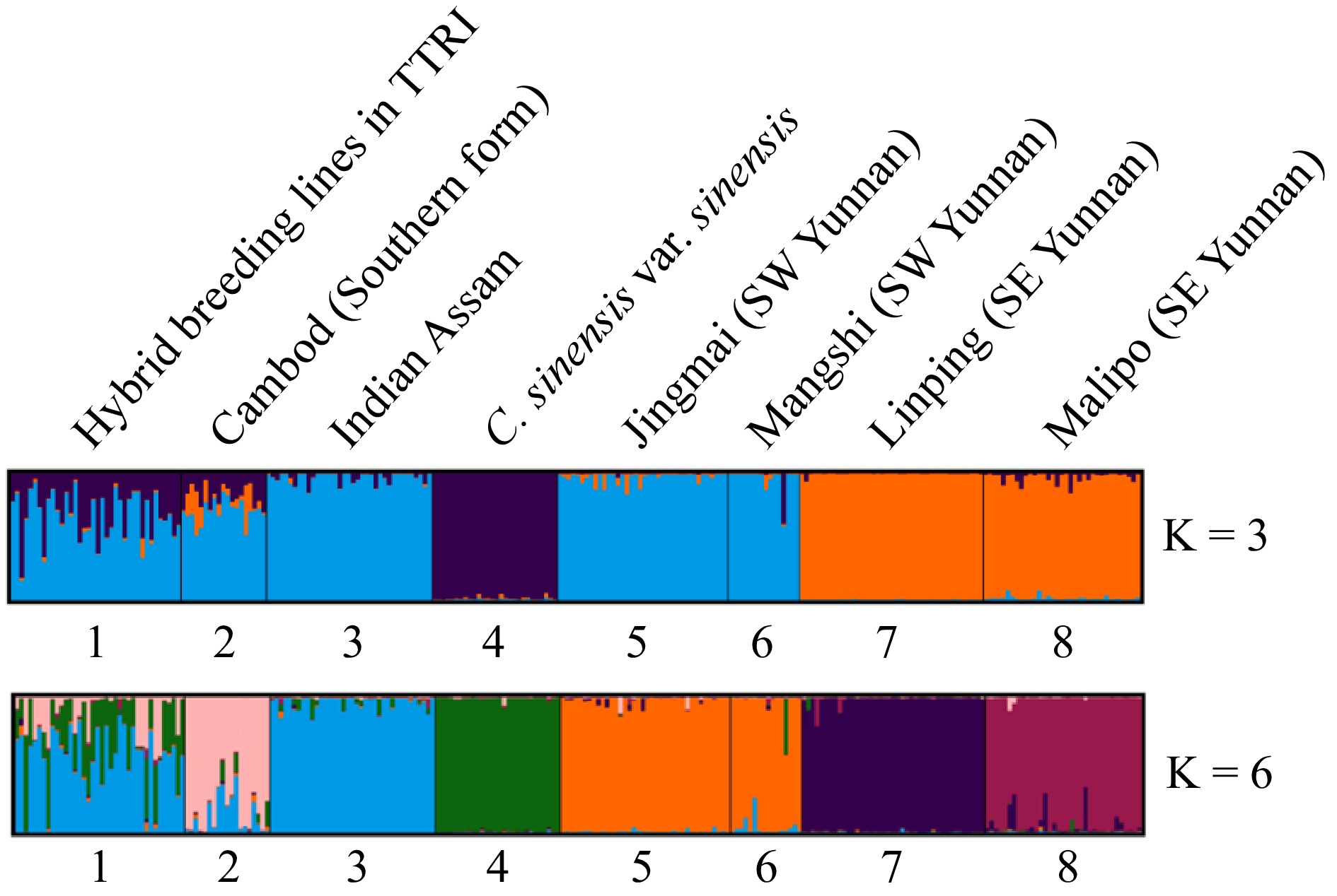 • Out of the 94 TTRI germplasm accessions analyzed in the present study, there were 38 breeding lines that are putative hybrids, but their exact parentage was not clear. STRUCTURE analysis clearly revealed the parentage/ancestry of these hybrids based on the six different genetic populations. In average, Indian assamica, Cambod assamica and Chinese var. sinensis contributed 54.9%, 14.0% and 28.1% of the parentage to these breeding lines respectively. The influence of China var. assamica, either from southwest or southeast Yunnan to these hybrids is negligible. It's well known that each germplasm group has its featured attributes in terms of agronomic traits and quality characteristics. For example, the var. assamica is known for its high polyphenol content, broad leaf, and adaptability to hot and humid climates. The var. sinensis is well known for its adaptability to hardy environments, theanine content, and small leaf. The Cambod assamica has the unique ability to tolerate drought conditions. The inter-population hybrids, therefore, have the advantage that combine different specific traits from a broad genetic background. Therefore, most the advanced breeding lines and released clones from TTRI are hybrids in nature.