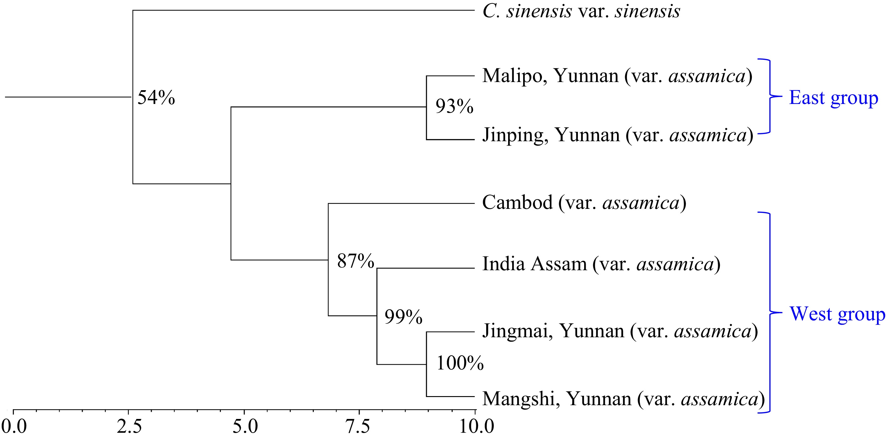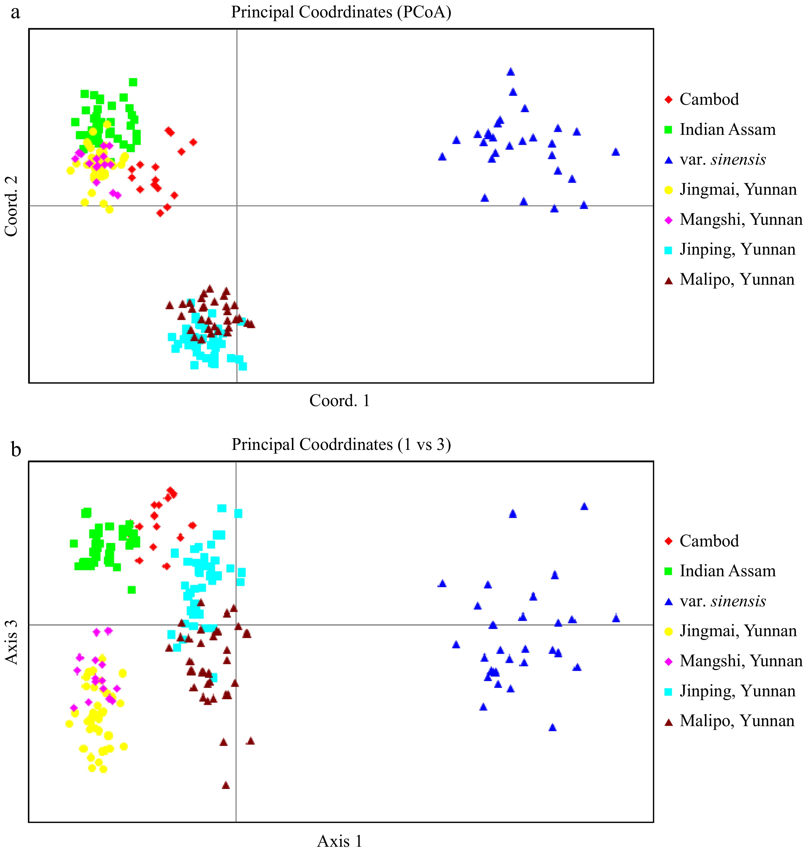 (3) China var. assamica from Southwest Yunnan, which was represented by Jingmai and Mangshi in this study. Since the genetic divergence between Jingmai and Mangshi is small, these two clusters can be considered as two sub-populations within the Southwest Yunnan population;