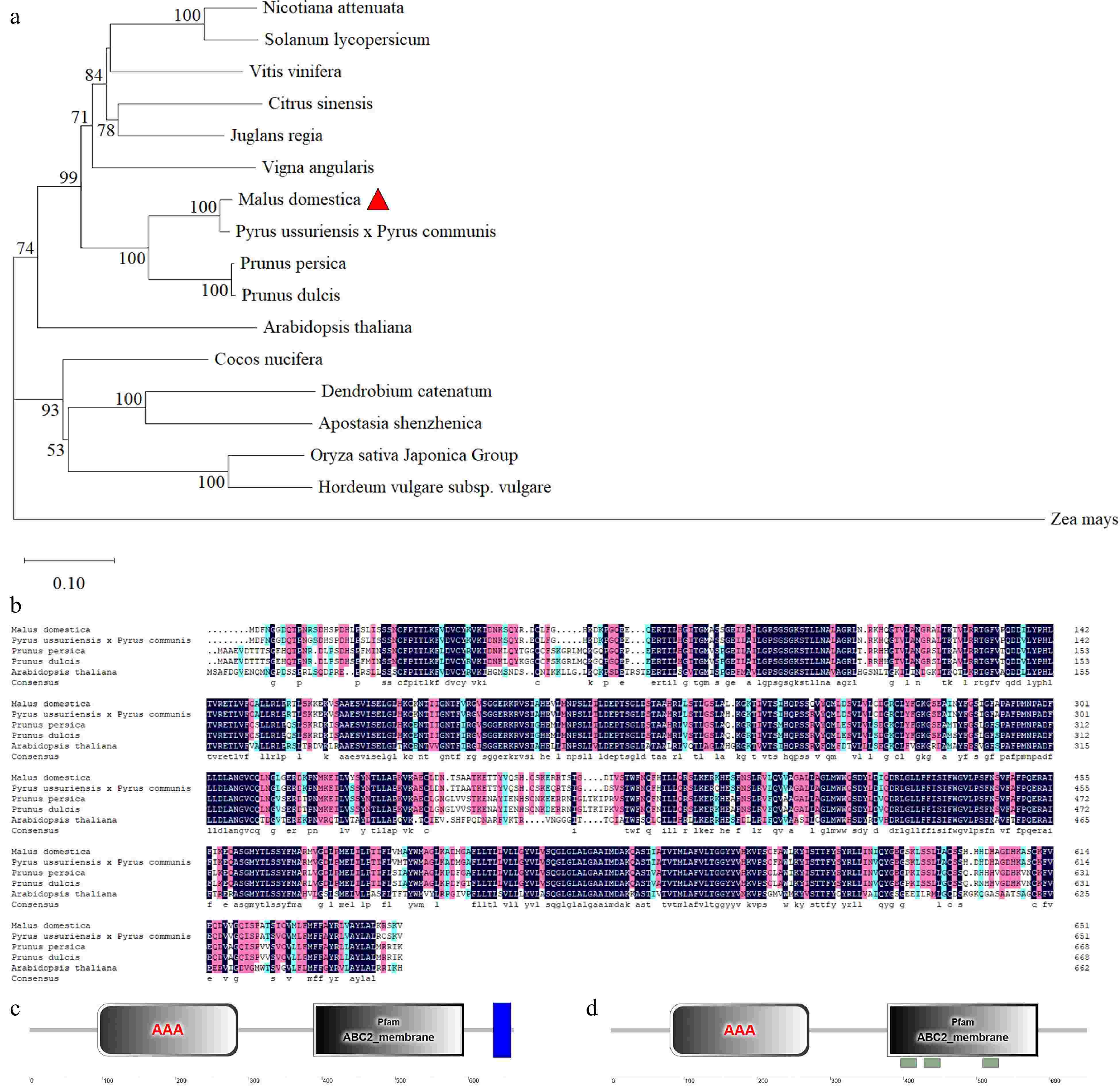 Phylogenetic analysis, multiple sequence alignment and conserved motif analysis of ABCG25 proteins. (a) Phylogenetic tree assembled from ABCG25 proteins of 17 different species: Nicotiana attenuate, Solanum lycopersicum, Vitis vinifera, Citrus sinensis, Juglans regia, Vigna angularis, Malus domestica, Pyrus ussuriensis × Pyrus communis, Prunus persica, Prunus dulcis, Arabidopsis thaliana, Cocos nucifera, Dendrobium catenatum, Apostasia shenzhenica, Oryza sativa Japonica Group, Hordeum vulgare subsp. Vulgare, Zea mays. (b) Multiple sequence alignment of ABCG25 protein from different species: Malus domestica, Pyrus × bretschneideri, Prunus persica, Prunus dulcis, Arabidopsis thaliana. The conserved structural domains analysis of (c) AtABCG25 protein and (d) MdABCG25 protein sequences. The gray rectangles represent AAA domain. The blue rectangles represent transmembrane domain (TMD).