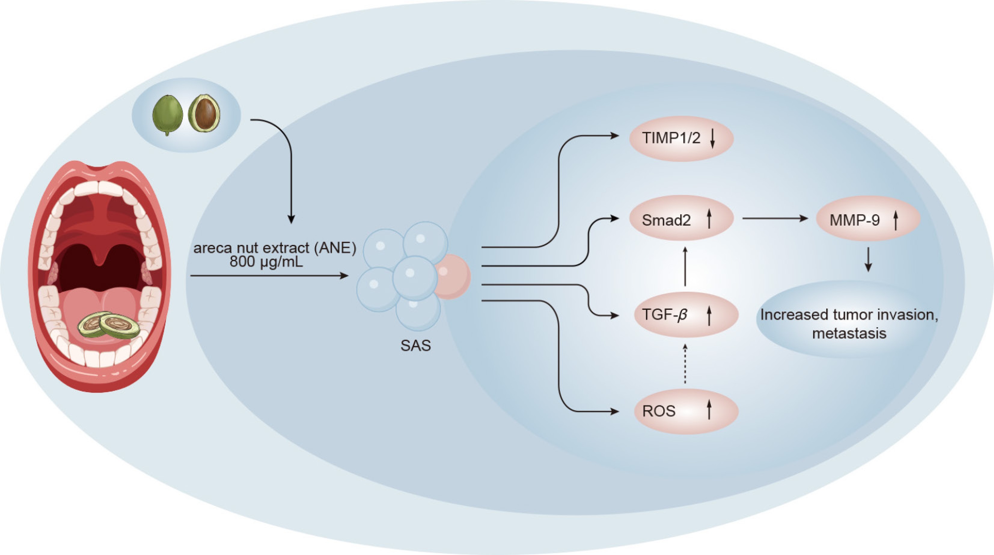 Recent in vitro and mechanistic studies have further clarified the specific pathways through which areca nut extract (ANE) activates profibrotic and pro-invasive signaling in oral epithelial/keratinocyte models. Non-cytotoxic concentrations of ANE can induce TGF-β1 expression and activate Smad2 phosphorylation, while also triggering Smad-independent pathways, including TAK1 and downstream MAPK, PI3K/Akt, EGFR, and JAK signaling cascades. As illustrated in Fig. 2, these signaling events collectively upregulate MMP-9 and downregulate TIMPs, leading to extracellular matrix (ECM) degradation and remodeling. This process can be mitigated by antioxidants (e.g., catalase), TAK1/ALK5 inhibitors, or certain plant extracts, indicating that the ROS–TGF-β/TAK1–MMP-9 axis is a critical pathway through which ANE causes tissue damage and tumor invasion. These findings provide additional molecular evidence for the disturbance of local ECM metabolism in the oral cavity and help explain the seemingly paradoxical phenotype whereby betel quid/ANE exposure promotes both fibrosis (aberrant collagen deposition) and cancer cell invasion/metastasis[44,45,61,62].