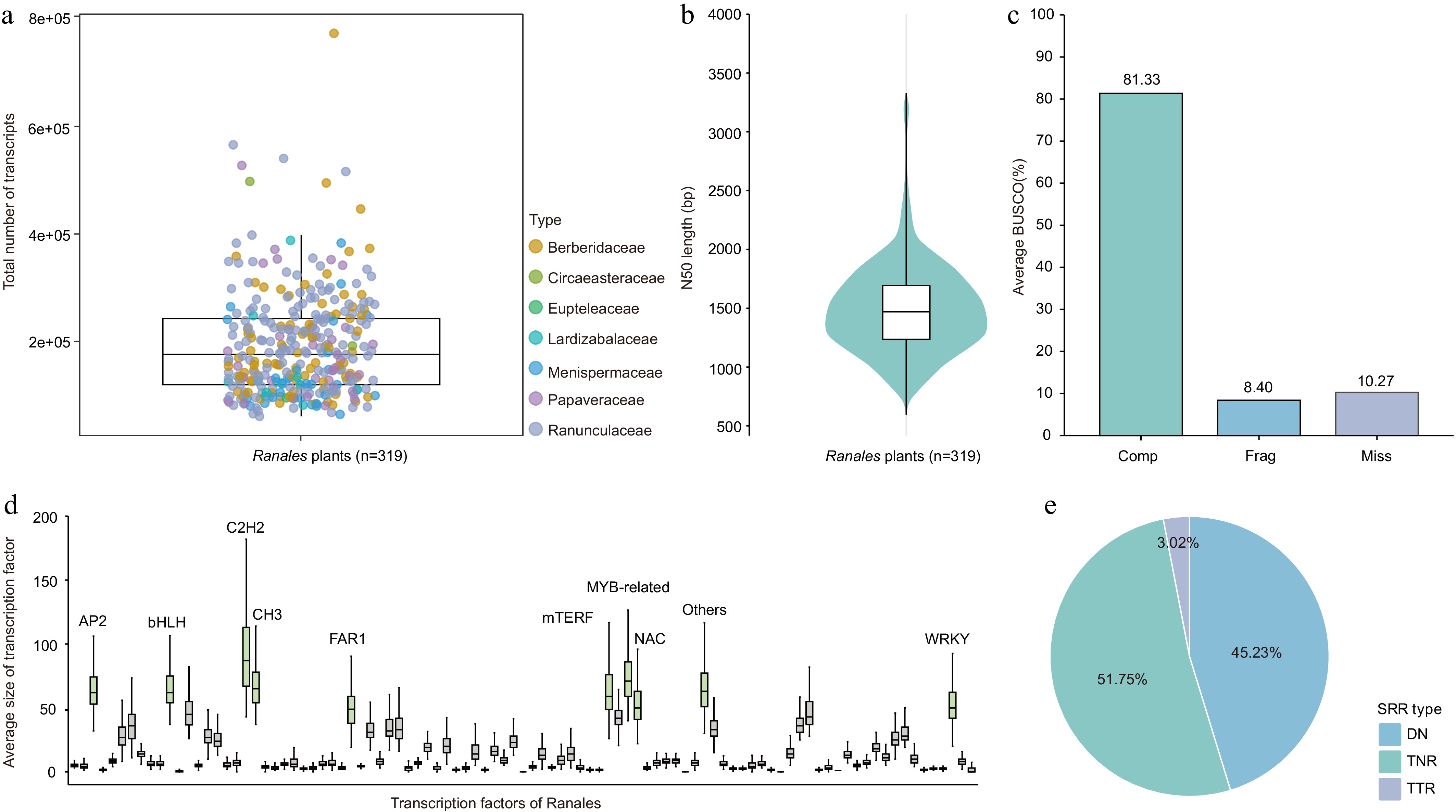 • A total of 319 transcriptome datasets from plants of the order Ranales were obtained. (Supplementary Table S1). In total, 22.17 billion clean reads were obtained, corresponding to 3.23 Tb of clean bases, with an average data volume of 10.12 Gb per species (Supplementary Table S1). All transcriptome datasets were de novo assembled using Trinity[19], yielding a total of 61,487,655 transcripts with an average length of 858 bp and an N50 size of 1,489 bp (Fig. 1a, b; Supplementary Table S3). The completeness of the assembled transcriptomes was assessed using BUSCO (Benchmarking Universal Single-Copy Orthologs)[35]. The results showed that, on average, 89.73% of the conserved plant orthologs were present in the assembled transcriptomes (Fig. 1c), with detailed results provided in Supplementary Table S4. According to database annotations, 54% of the total transcripts could be annotated with known proteins or functional domains (Supplementary Table S5). A total of 530,459 transcription factors (TFs) were predicted from all transcripts, averaging 1,662 TFs per species. Among these, MYB/MYB-related constituted the most abundant TF family in the Ranunculales transcriptomes, followed by C2H2 and bHLH (Fig. 1d; Supplementary Table S6). Furthermore, 6,378,110 simple sequence repeats (SSRs) were identified within the Ranunculales transcriptomes (Fig. 1e; Supplementary Table S7).