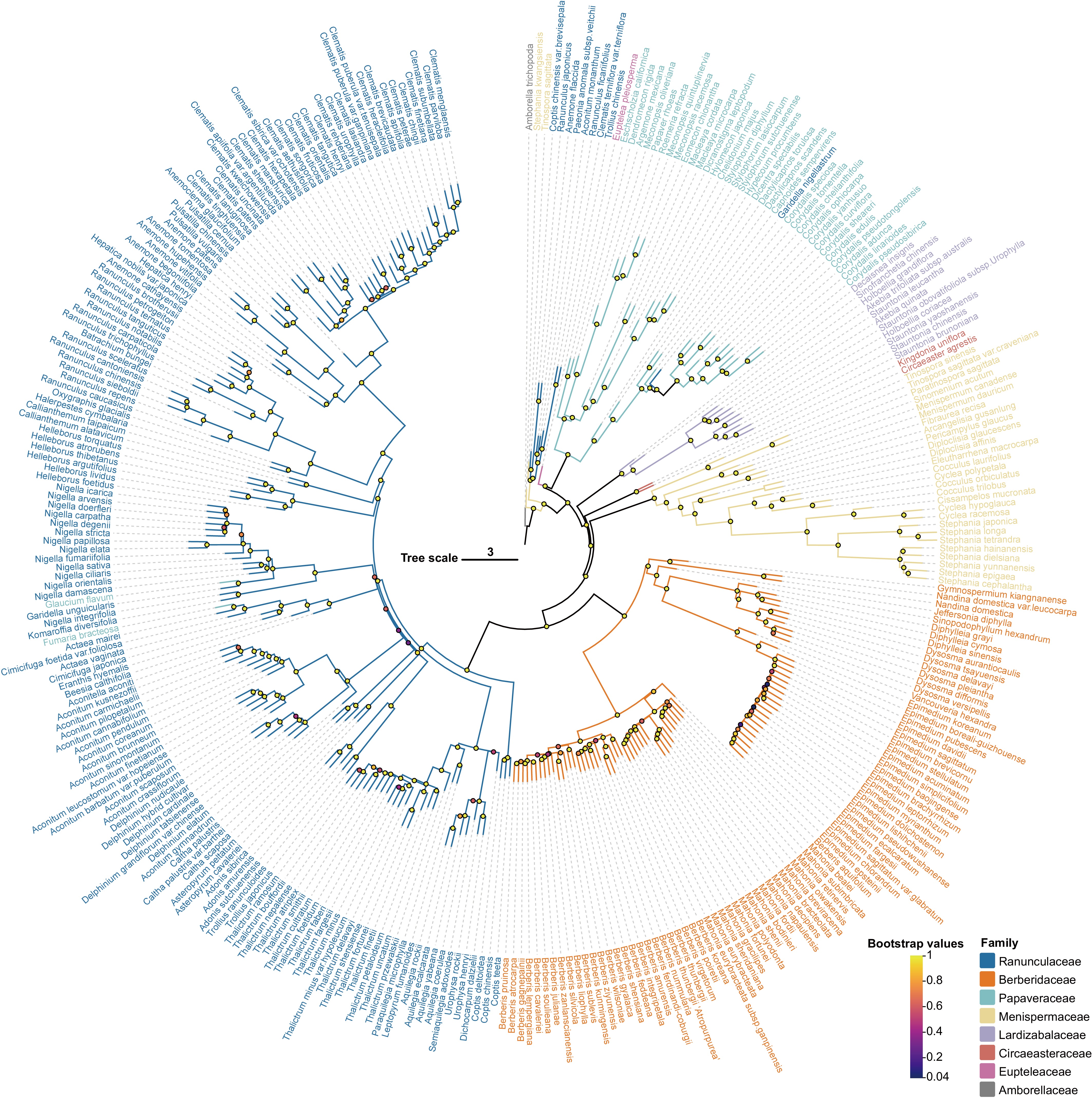 Bootstrap values are color-coded on the branches of the phylogeny. Excluding the outgroup, seven distinct colors represent the major families within Ranunculales: Ranunculaceae, Berberidaceae, Papaveraceae, Menispermaceae, Lardizabalaceae, Circaeasteraceae, and Eupteleaceae.