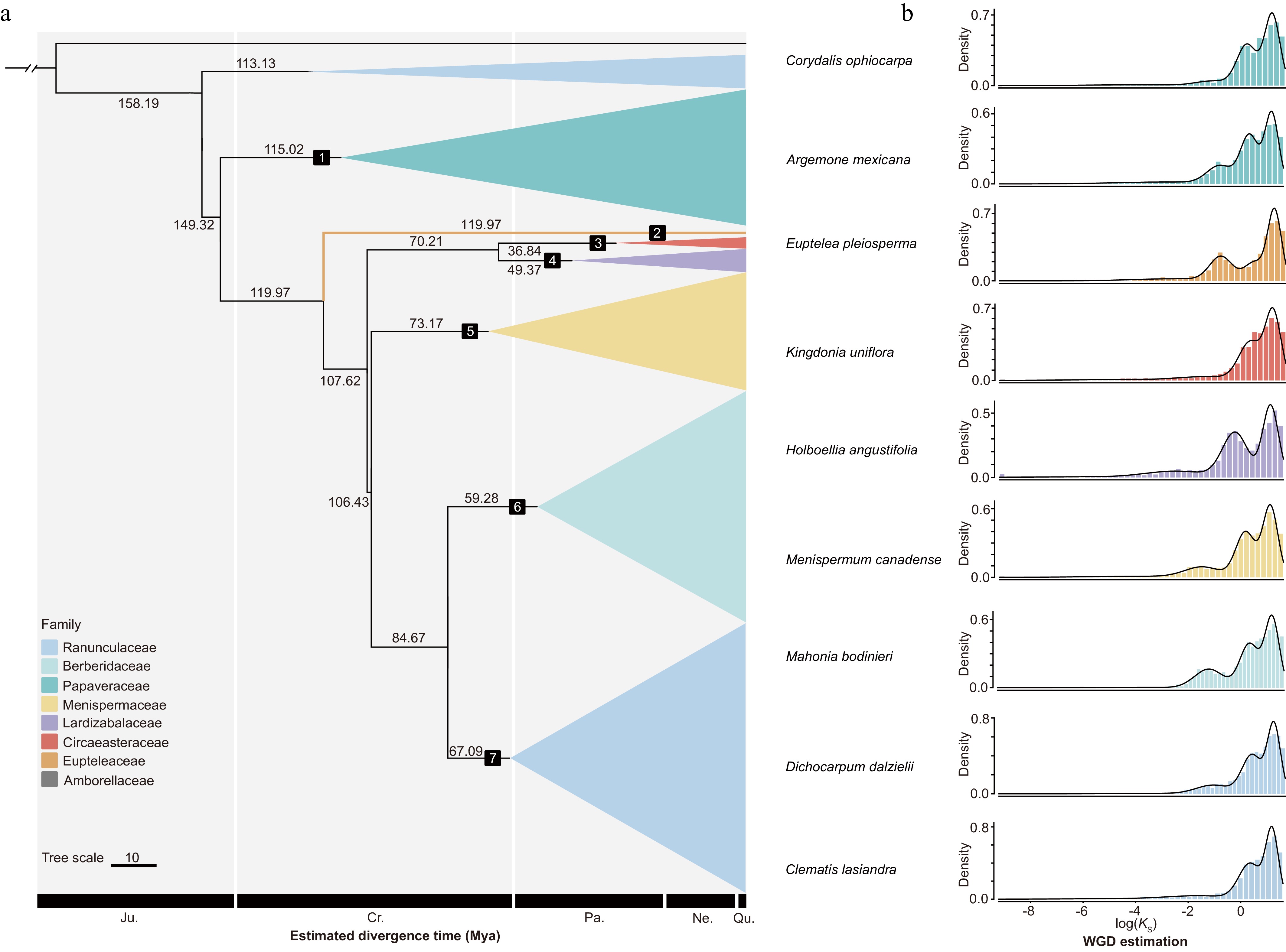 (a) Divergence time inference: geological time scale abbreviations are shown at the bottom, with numbers on branches indicating divergence times in million years ago (Mya). (b) Inferred whole-genome duplication events in representative species of each Ranunculales family, based on KS distributions.