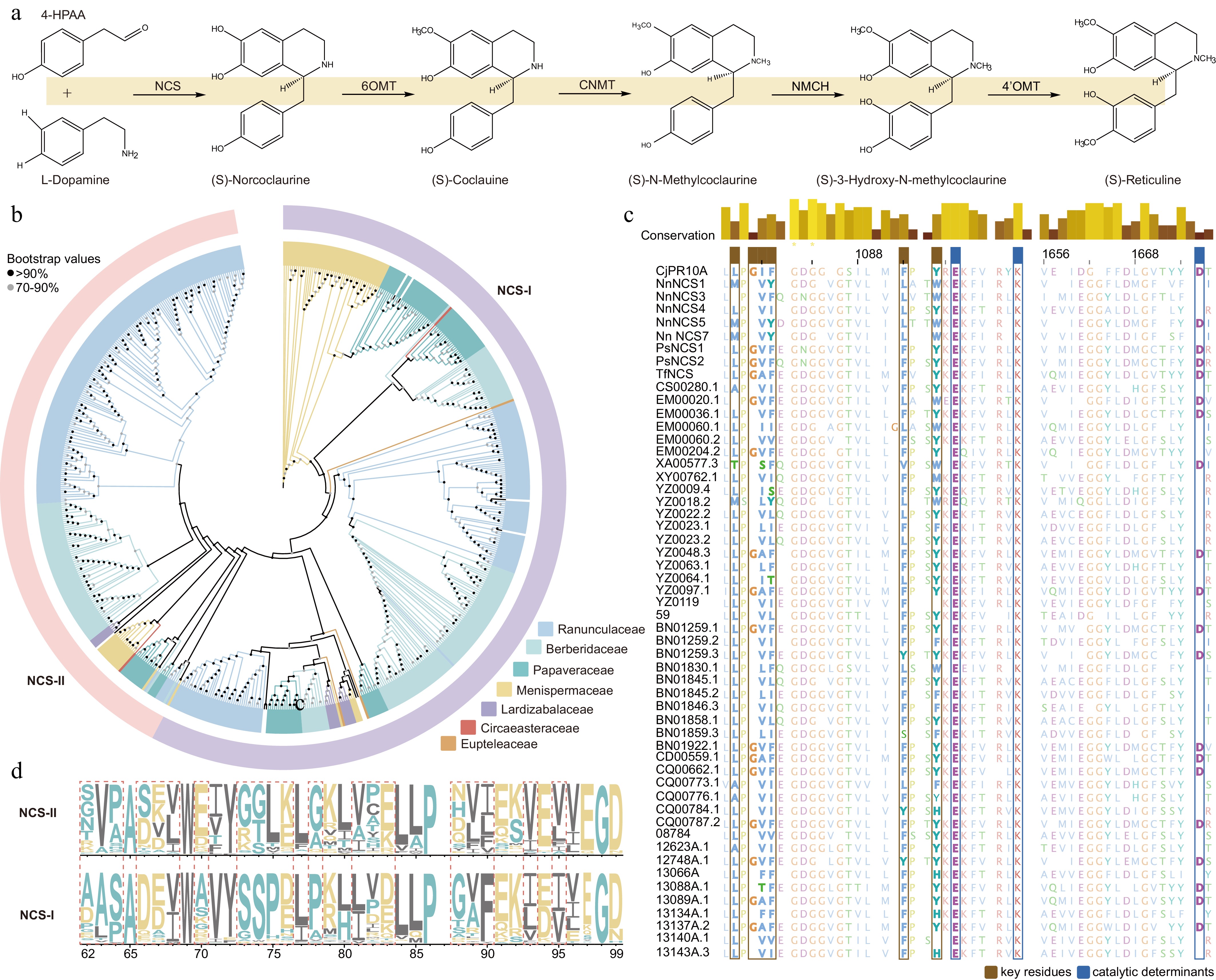 (a) Initial steps of the classical alkaloid biosynthetic pathway leading to the core intermediate (S)-Reticuline. (b) Phylogenetic analysis of the Bet v1 gene family showing its division into two subfamilies: NCS-I and NCS-II. (c) Sequence alignment of key residues and catalytic determinants in selected important NCS sequences. (d) Sequence logo of multiple sequence alignments for the NCS-I and NCS-II clades, with dashed boxes highlighting residues that show significant differences between the two clades.
