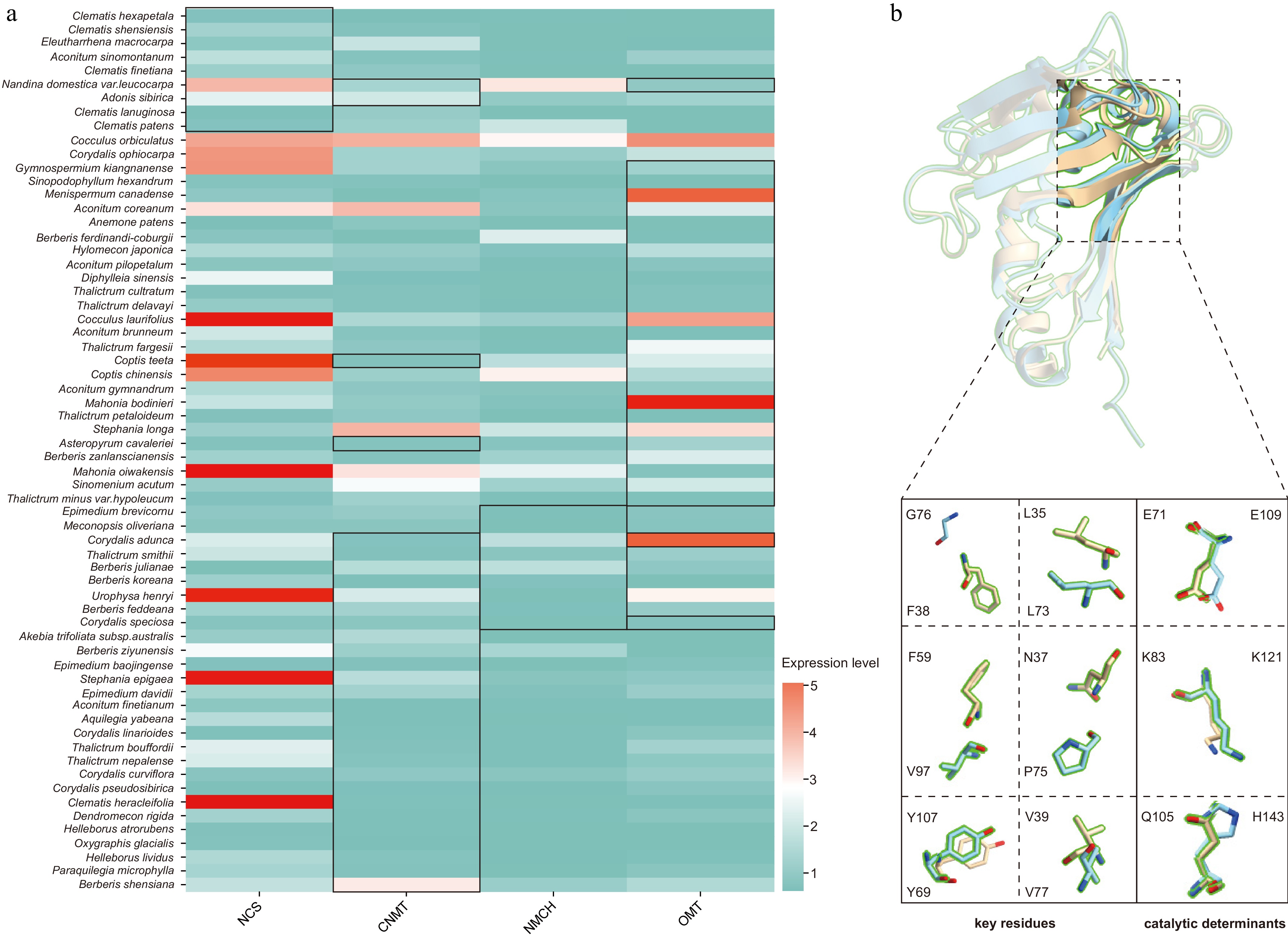 • To further investigate the selective pressures acting on key genes in the BIAs pathway, we first conducted positive selection tests on the filtered key genes within their respective phylogenetic branches. The results revealed that among the homologous sequences, nine NCS sequences showed signals of positive selection, seven of which originated from Ranunculaceae. Similarly, nine NMCH homologous sequences were under positive selection, with four from Berberidaceae and three from Papaveraceae. Furthermore, 36 CNMT and 32 OMT homologous sequences exhibited positive selection, with the highest proportions of these sequences coming from Ranunculaceae, Berberidaceae, and Papaveraceae (Supplementary Table S12). Subsequently, we quantitatively compared these positively selected genes with their sister-group genes by analyzing the FPKM values of the homologous sequences for NCS, NMCH, CNMT, and OMT. The results indicated that the expression levels of genes in the positively selected branches did not show consistent or systematic changes compared to other genes across the major tissues examined (Fig. 5a; Supplementary Table S13).