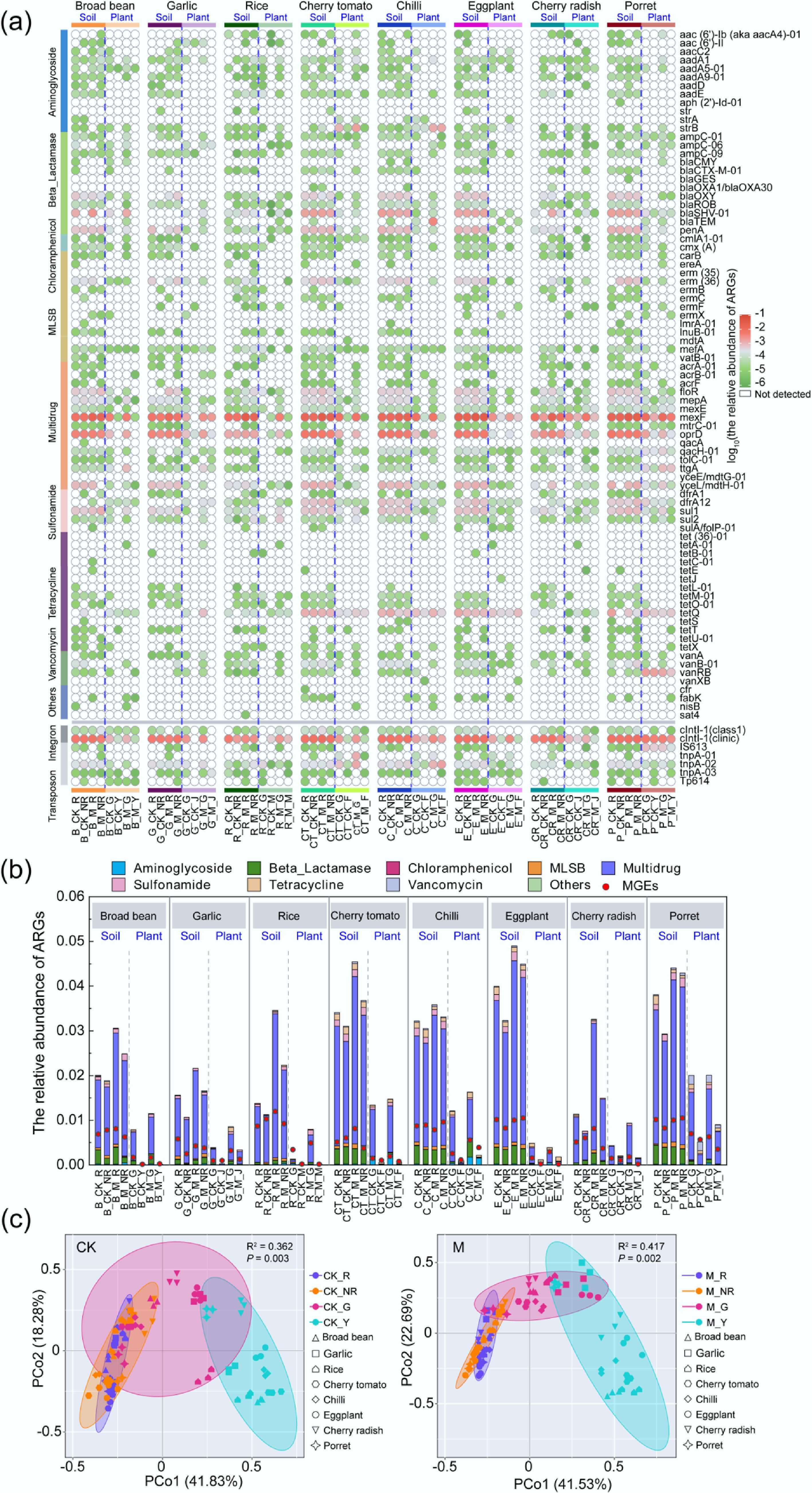 Distribution of ARGs in the soil-plant system of different plants. (a) Detection of ARGs in all samples. (b) Relative abundance of ARGs in all samples. (c) Distribution of ARGs in all samples. (B, broad bean; G, garlic; R, rice; CT, cherry tomato; C, chilli; E, eggplant; CR, cherry radish; P, porret; CK, treatments without fertilizer; M, application of manure treatments; R, rhizosphere soils; NR, non-rhizosphere soils; G, plant roots; Y or J or F or M, edible parts of plants).