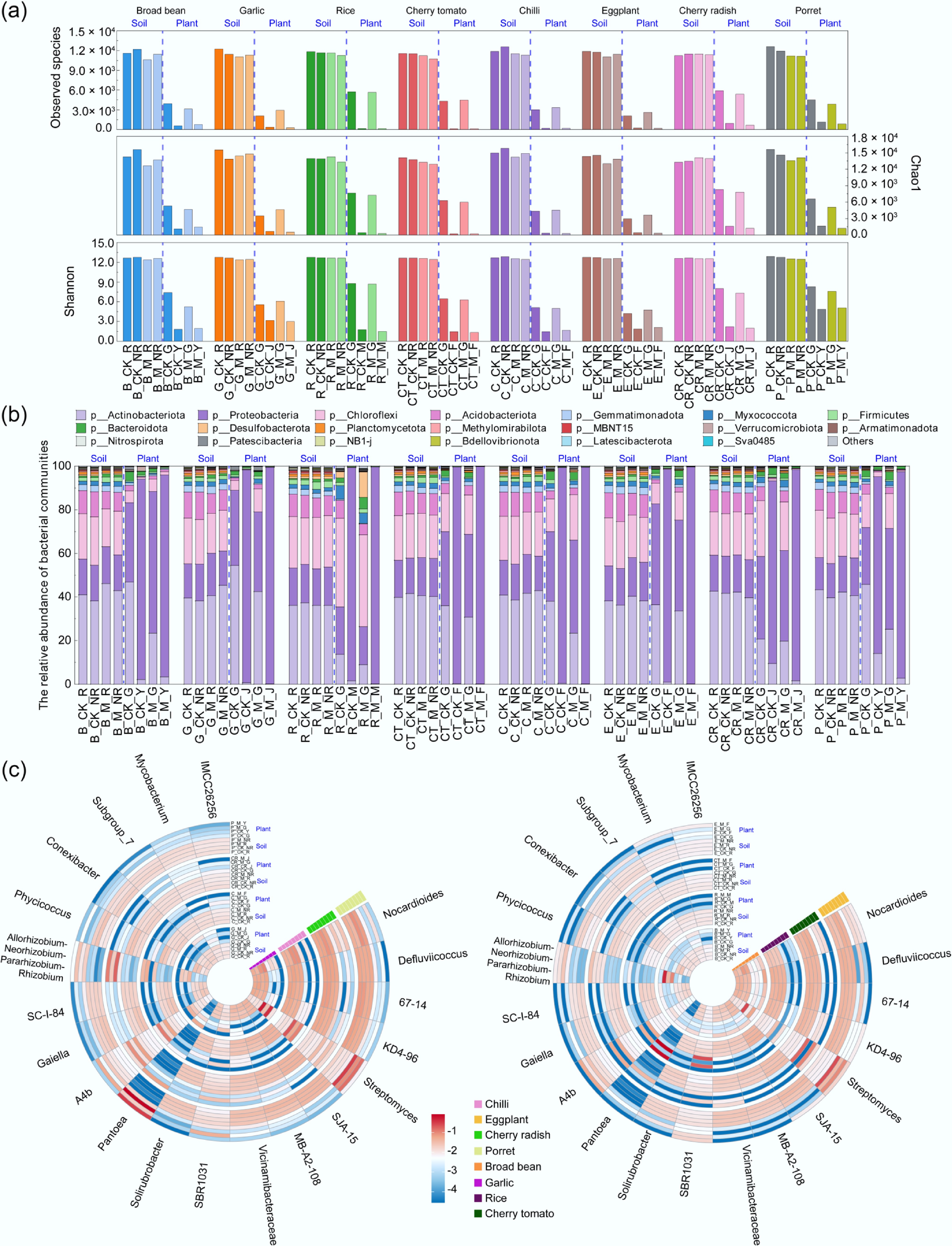 • There were significant differences in soil and plant bacterial communities among different crops (Fig. 4 and Supplementary Fig. S2). As shown in Fig. 4a, the observed species and α-diversity in the soil bacterial community were significantly higher than those in the plant samples, and the diversity of the endophytic bacterial community in the root of plants was also significantly higher than that in the edible aboveground tissues (p < 0.05). The bacterial community composition of rhizosphere and non-rhizosphere soil of different crops and vegetables at the phylum and genus levels under livestock manure application and control treatment was shown in Fig. 4b, c. At the phylum level, Actinobacteriota (36.00%–46.05%), Chloroflexi (17.36%–23.52%), Proteobacteria (14.78%–19.41%), Acidobacteriota (7.95%–12.59%), and Gemmatimonadota (2.00%–3.32%) consistently emerged as the five dominant bacterial phyla in both manure-amended and unfertilized treatments, in both rhizosphere and non-rhizosphere environments. However, the characteristics of plant endophytic bacteria community are different, among which Proteobacteria occupied the highest abundance ratio, accounting for 14.78%–99.57%. Then, followed by Actinobacteriota (0.09%–54.36%), Chloroflexi, Acidobacteriota, and Gemmatimonadota (0.00%–3.33%). At the genus level, Nocardioides was the most abundant in soil, while Streptomyces was the most abundant in plants. When comparing rhizosphere and non-rhizosphere soil, the total abundance of Actinobacteriota in rhizosphere soil increased by approximately 2.17% relative to non-rhizosphere soil, while Acidobacteriota was 4.17% lower.