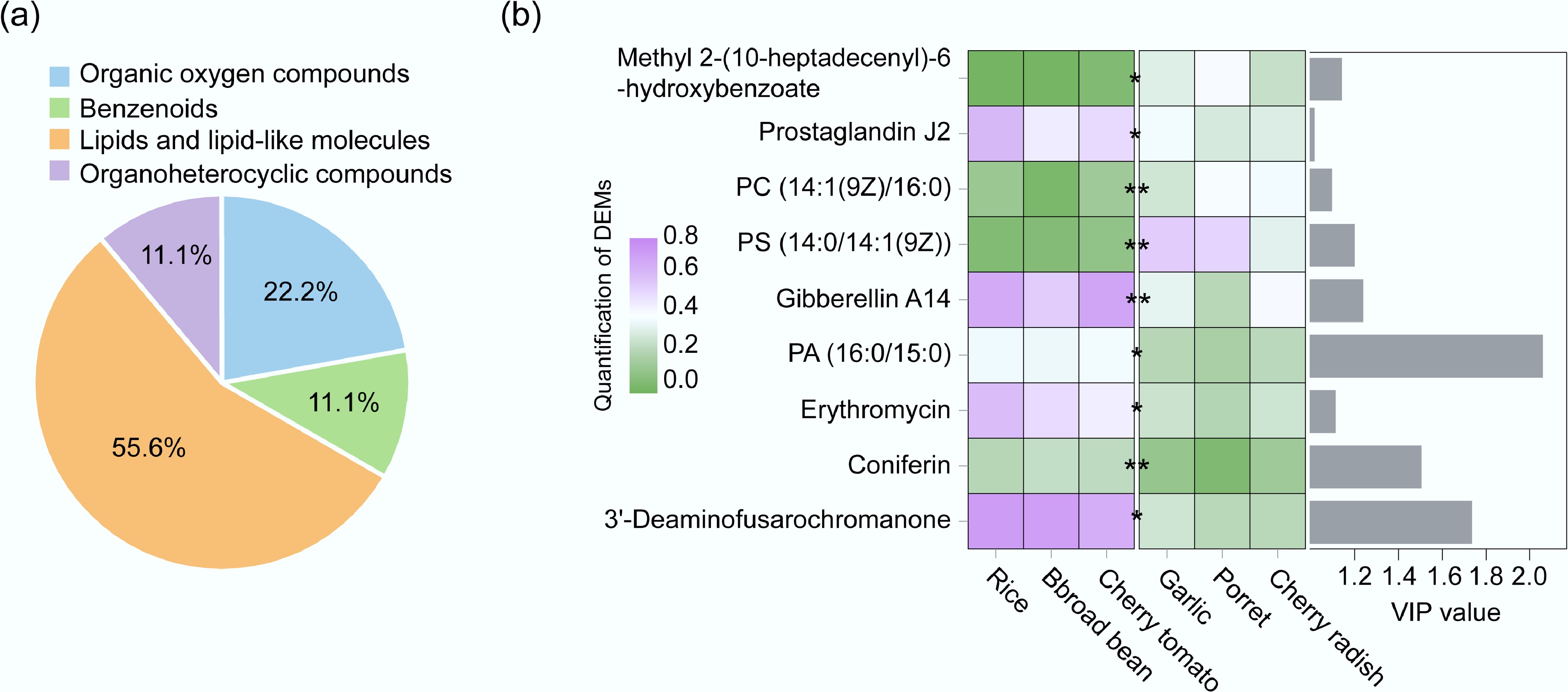 • Rhizosphere metabolites affected the ARG distribution and spread in soil-plant systems of different crops. Three crops with high ARG abundances (garlic, cherry radish, and porret) and three crops with low ARG abundances (broad bean, rice, and cherry tomato) were selected and divided into two comparison groups. The rhizosphere metabolites were analyzed by OPLS-DA. Using a fold change ≤ 0.67 or ≥ 1.5 and VIP > 1 as thresholds, nine DEMs were identified in the high abundance group and the low abundance group. The categories of DEMs included lipids and lipid-like molecules, organic oxygen compounds, organoheterocyclic compounds, and benzenoids, of which lipids and lipid-like molecules accounted for the largest proportion (55.6%) (Fig. 5a). In the group with high ARG abundances (Fig. 5b), the content of Prostaglandin J2 (lipids), Gibberellin A14 (lipids), PA (16:0/15:0) (lipids), Erythromycin, and 3'-Deaminofusarochromanone was up-regulated. The content of the other five kinds of DEMs—PC (14:1[9Z]/16:0) (lipids), Methyl 2-(10-heptadecenyl)-6-hydroxybenzoate, PS (14:0/ 14:1[9Z]) (lipids), and coniferin—was down-regulated. Additionally, the VIP value of PA (16:0/15:0) (lipids) was the highest, which indicated that lipids in rhizosphere metabolites had a more obvious influence on endophytic bacteria spread and ARG distribution in different crops.