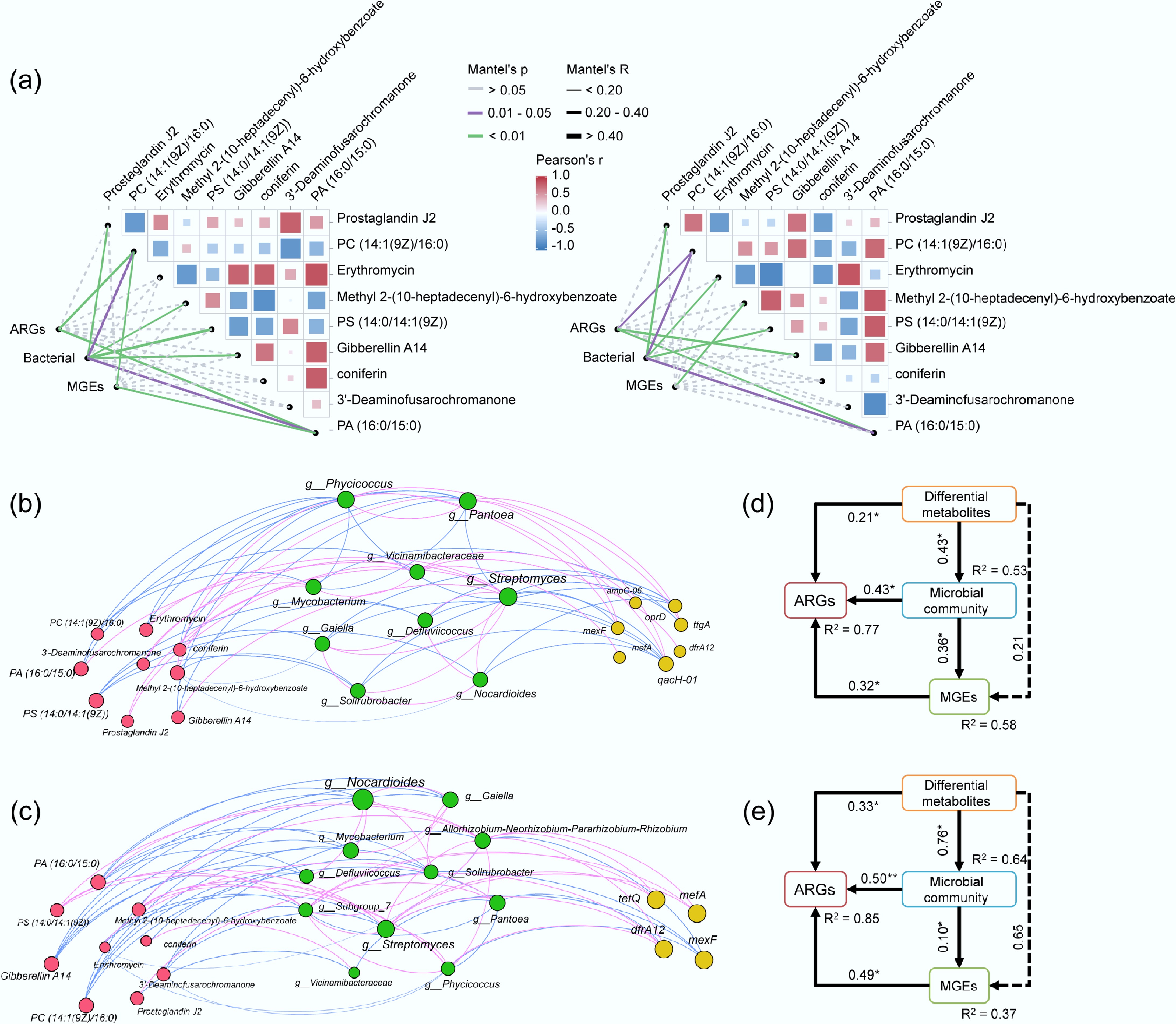 Mantel test results showing the correlation between DEMs, MGEs, ARGs, and bacterial community in the (a)-left high-abundance crop group, and (a)-right the low-abundance crop group. (b) Co-occurrence networks based on Spearman's rank correlation coefficients in the high-abundance crop group, and (c) the low-abundance crop group. Nodes signify the abundance of individual ARGs, DEMs, or bacterial taxa. Positive and negative relationships are represented by pink and blue arrows, respectively. The SEMs in (d) and (e) depict the effects of MGEs, bacterial communities, and DEMs on ARGs for the high- and low-abundance crop groups, respectively.