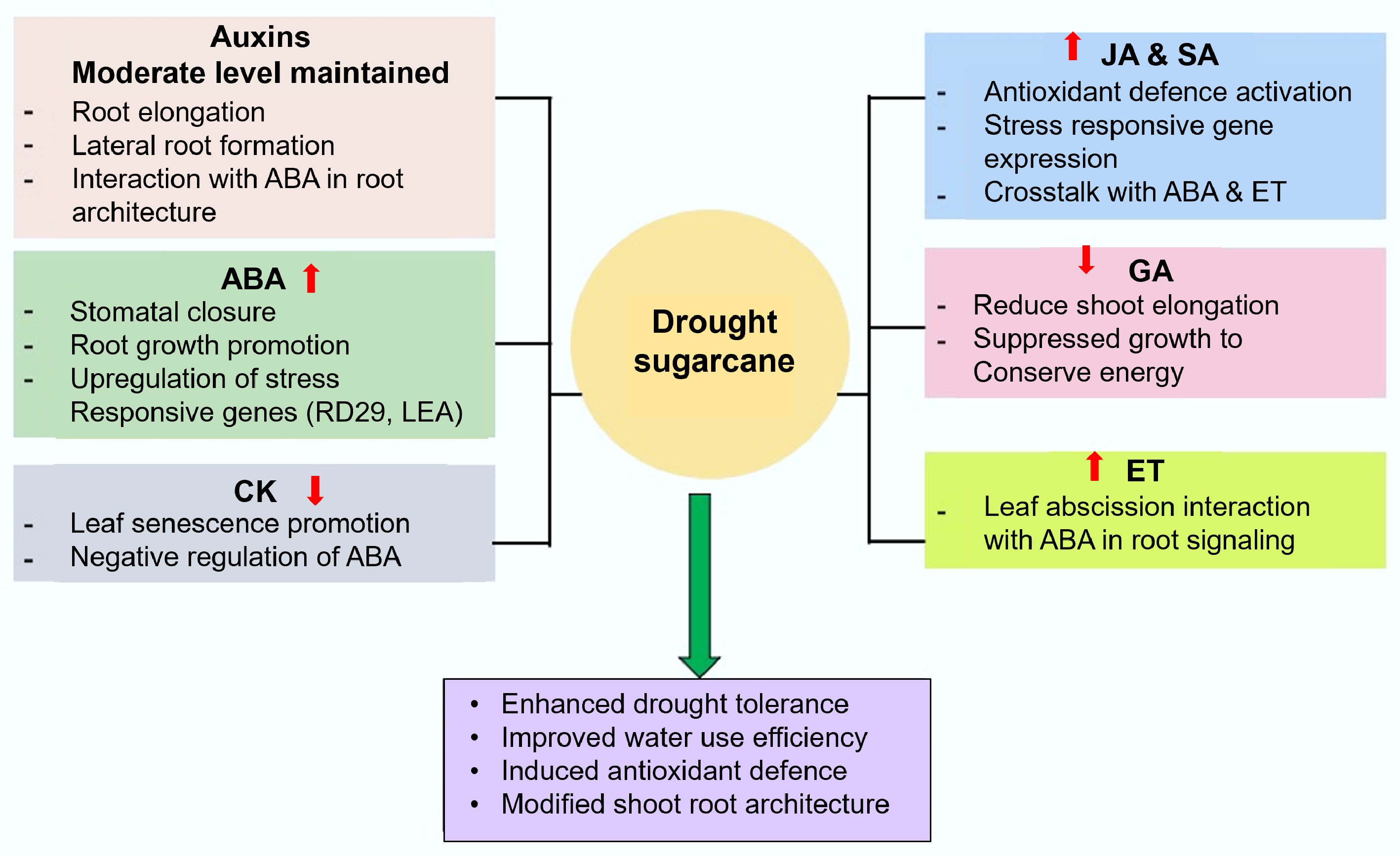 Misra V, Mall AK. 2025. Application of phytohormones exogenously to ameliorate sugarcane's response to water stress. Agricultural Ecology and Environment 1: e006 doi: 10.48130/aee-0025-0006