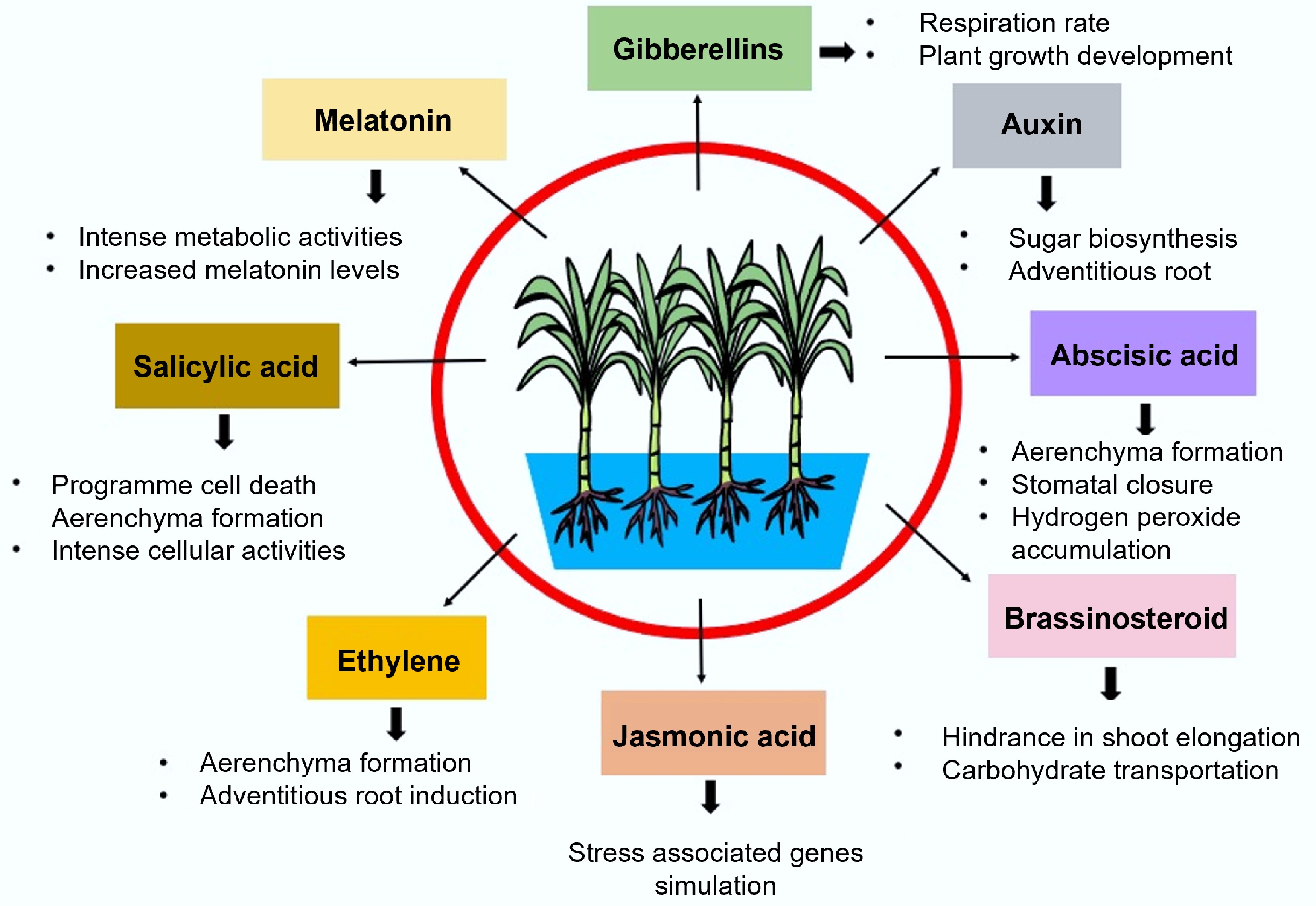 The balance of multiple phytohormones is fundamental to regulating plant physiological metabolism, growth, and development. Endogenous hormones orchestrate the entire plant life cycle[31−33]. Through complex signalling networks, plants adjust hormone synthesis and transport to respond to environmental stresses, including waterlogging. In this context, hormones serve as vital endogenous cues contributing to stress adaptation[34−36]. Similar phytohormones are also involved in sugarcane adaptation to waterlogging conditions (Fig. 2). ABA plays a central role by regulating stomatal function through modulation of guard cell density, thereby influencing plant water potential. It also promotes the formation of root aerenchyma under waterlogged conditions[37,38]. IAA is essential for plant growth and development[39,40]. GAs influence cell size and proliferation, thereby governing multiple growth and developmental processes[41]. SA, a key phenolic compound, enhances plant resilience by activating antioxidant systems and upregulating stress-responsive genes[42−44]. Under waterlogging, SA acts as a signalling molecule that induces physiological adjustments. Although JA is well-known for its role in abiotic stress responses, its specific involvement in waterlogging tolerance remains less explored[33,45−47]. The JA–ethylene (ET) interaction plays a critical role in root development and aerenchyma formation under waterlogged conditions. Notably, foliar application of methyl jasmonate has been shown to elevate ethylene levels, which in turn enhances tolerance to waterlogging stress[48].