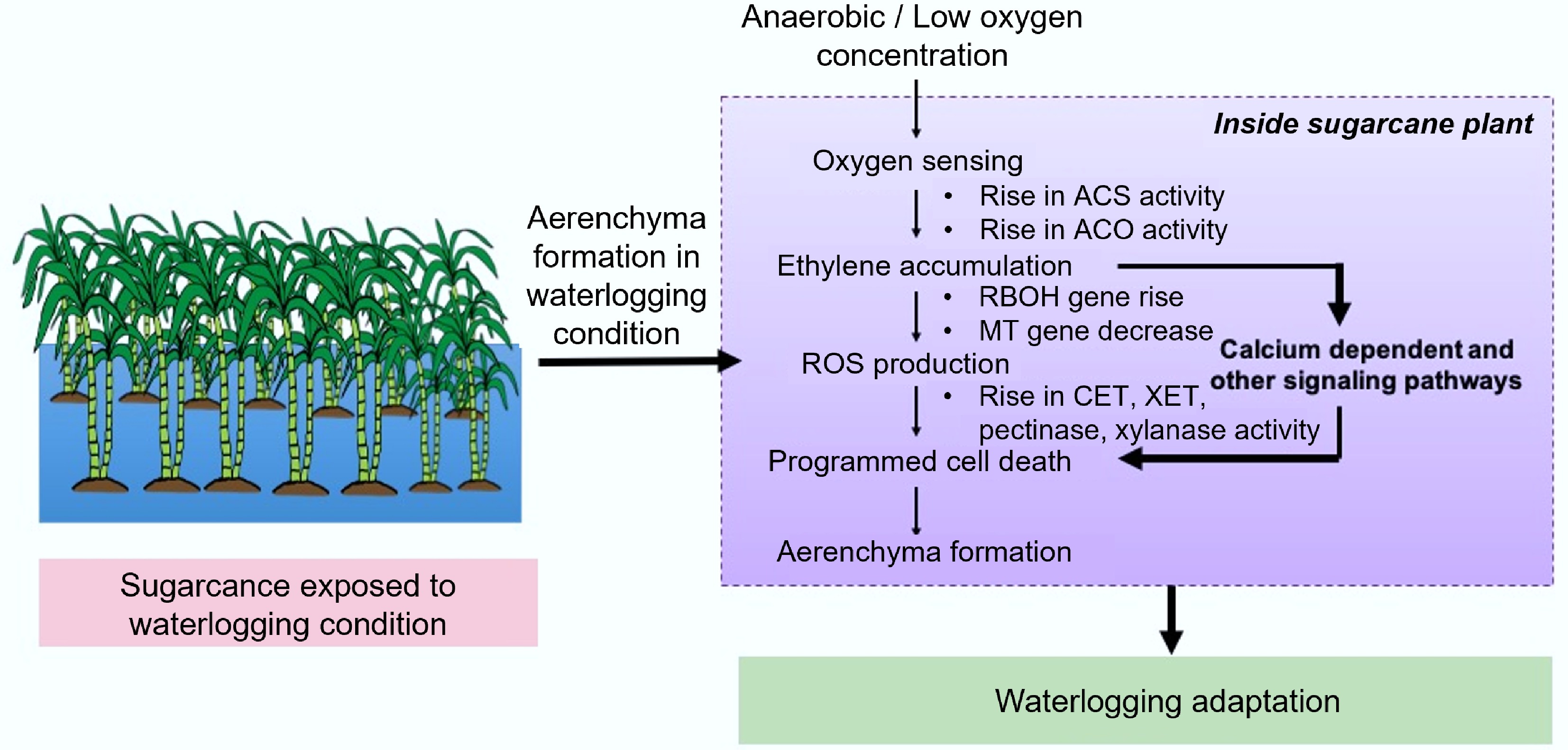 Lysigenous aerenchyma formation and its pathway waterlogging conditions. ACS: Aminocyclopropane-1-carboxylix Acid Synthase; ACO: ACC Oxidase; CEL: Cellulase; XET: Xyloglucan Endotransglycosylase; MT: Metallothionein; RBOH: Respiratory Burst Oxidase Homolog.
