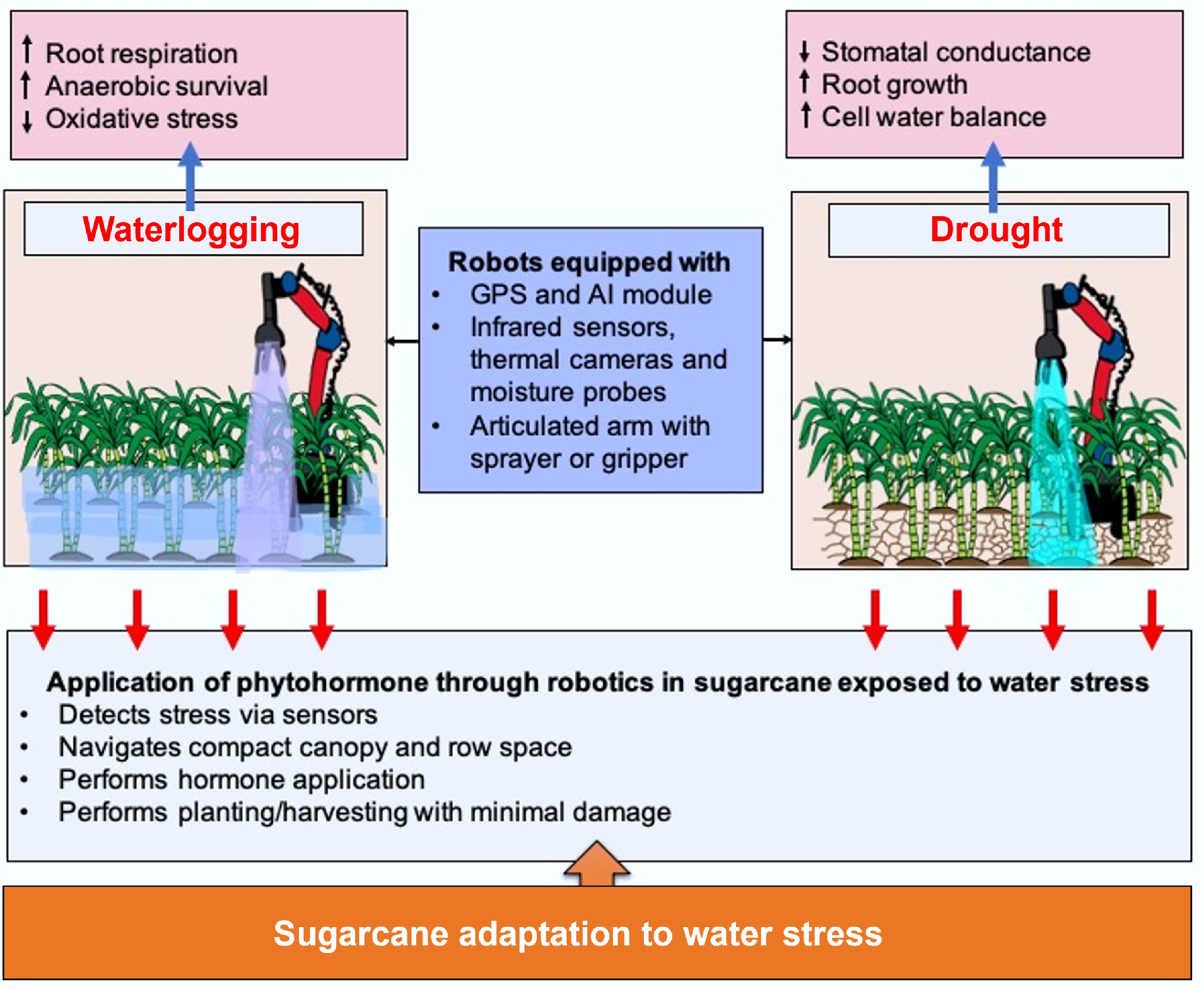 Collectively, these shortcomings underline the urgent need for precision hormone delivery systems that are adaptable to dynamic field conditions. Robotic platforms address conventional limitations through three core capabilities, viz., sensing and diagnostic, targeted application systems, and adaptive decision frameworks. Integration of agricultural robotics for exogenous phytohormone application in sugarcane for drought and waterlogging stress resilience helps enhance precision and efficiency. Robotics target sugarcane characteristics using a variety of innovative strategies that improve efficiency, minimize labour intensity, and maximize crop management (Fig. 4). The lengthy life cycle of sugarcane requires constant monitoring and labour-intensive measures. Self-driven robots are capable of moving around through dense sugarcane fields, finding their way around the compact row layout and compacted canopy that tends to impede hand inspection, thereby enabling regular monitoring throughout the long growth period[121]. During water deficit stress, robotic systems can monitor soil moisture content and water status of plants continuously using infrared sensors, cameras, and other technologies. Robots can deliver phytohormones like ABA or cytokinins to specific areas of the sugarcane fields when stress conditions are identified. The hormones improve drought resistance in the plant by regulating stomatal closure, stimulating root growth, and sustaining water balance in the cells. The robots' capability to penetrate the dense canopy of sugarcane and narrow row spaces enables them to target stressed plants precisely without causing damage. Robots used in sugarcane plantations are often equipped with advanced features like articulated arms with grippers to plant sugarcane sets correctly and manipulate plants gently so that they are not damaged. The robots also come with instructions to move along marked routes using lines or GPS to cover large fields systematically, with limited human involvement[121]. In addition, for waterlogging stress that negatively impacts oxygen levels in the supply to roots and overall plant well-being, robotic systems can identify early indicators of stress through real-time observations of soil saturation and plant reactions. Robots can then use phytohormones such as GA or ethylene inhibitors that assist plants in coping better with anaerobic environments, enhance root respiration, and mitigate toxic implications brought about by excess water. These treatments can mitigate yield loss and facilitate recovery from flooding stress[121]. These robots equipped with fuzzy real-time classifiers and vision systems, can detect leaf textures and variations that indicate weeds or plant health issues, even amidst the thick foliage[122]. This technological advantage accelerates field maintenance and reduces crop damage due to premature or imprecise interventions. Sugarcane's extended growth period can be enhanced through predictive modelling, supplemented by robot-based implementation. These predictions inform the robot schedules for irrigation, fertilization, or harvesting, dynamically adapting interventions to suit the long and variable development stages of sugarcane[123]. These predictions enable the robots to respond dynamically to changing field conditions, providing sugarcane plants with the right support to survive phases of waterlogging or drought. Autonomous robots, similar to the solar-powered Variable Swath herbicide Applicator, developed for weedicide application, can be adapted or designed to deliver phytohormones directly to sugarcane plants under drought and waterlogging stress conditions[124]. Kayode et al.[125] also developed a remote-controlled solar-powered pesticide sprayer vehicle which can be utilised for exogenous phytohormone foliar application in sugarcane to manage drought and waterlogging stress. These robots can be programmed to target specific zones within a field based on crop stress indicators, applying the correct dose of phytohormone only when required, thereby enhancing resource efficiency and crop resilience.