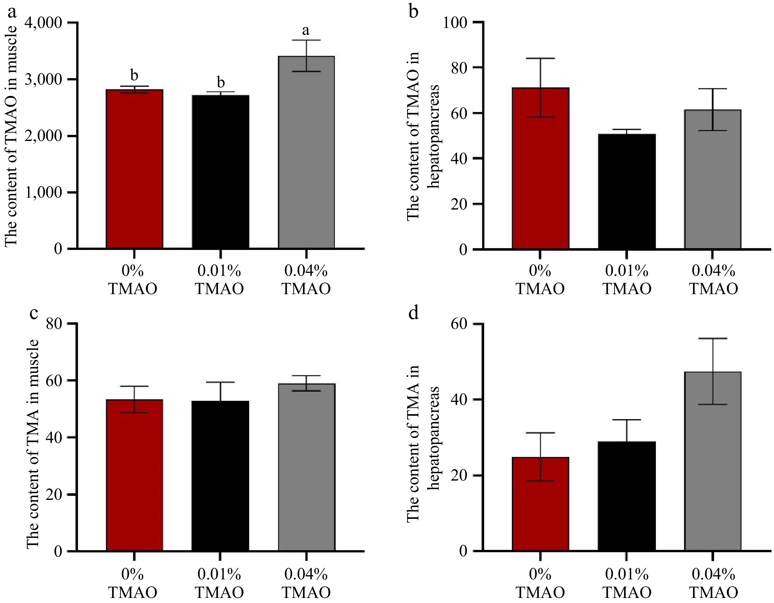 Effect of dietary TMAO on (a) the content of TMAO in muscle, (b) the content of TMAO in the hepatopancreas, (c) the content of TMA in muscle, and (d) the content of TMA in the hepatopancreas. The values are the means ± SEM (n = 3). Different letters indicate significant differences (p < 0.05).