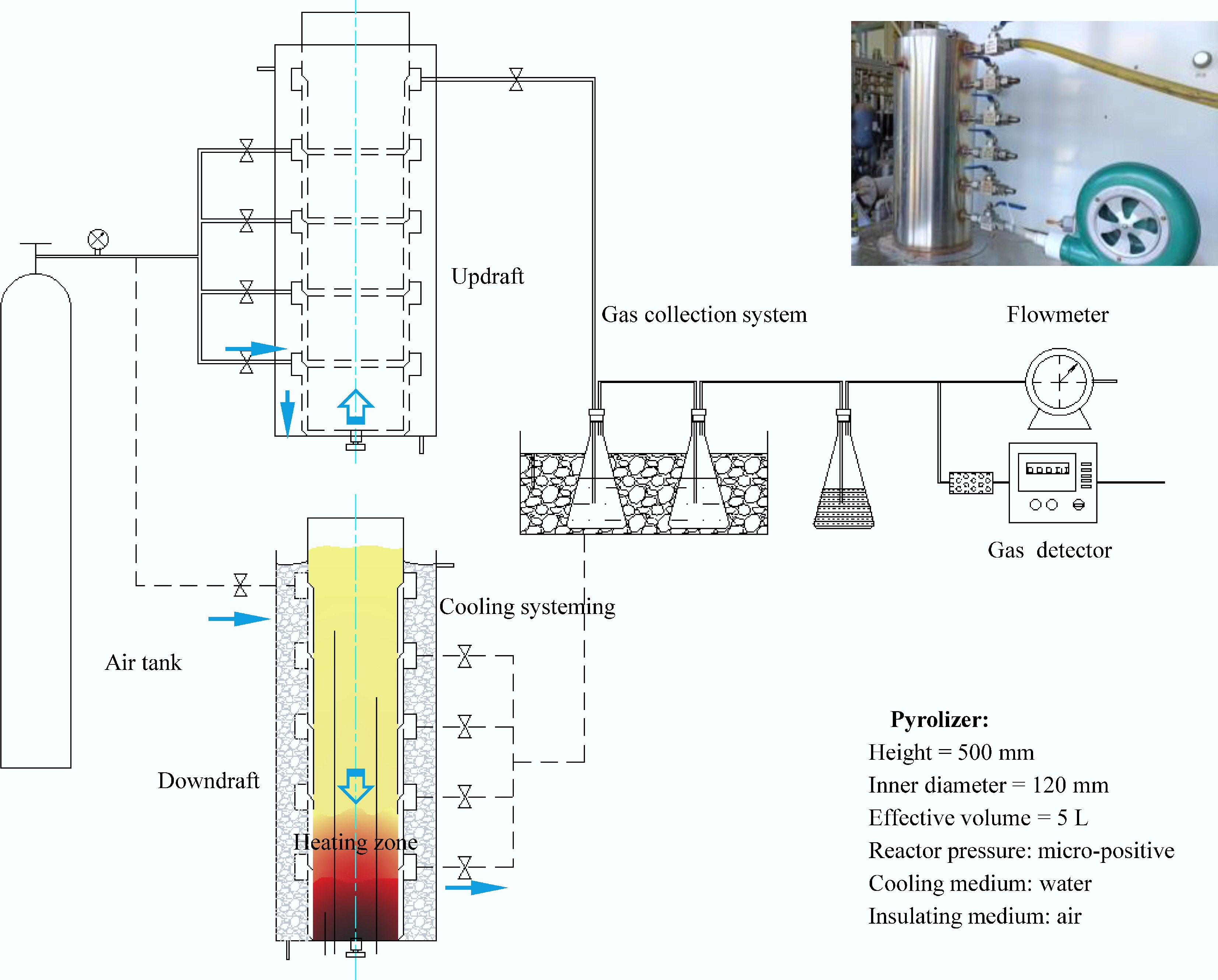 Schematic diagram of the developed internally heated cigar-type pyrolyzer and photograph of the pyrolysis experimental system.