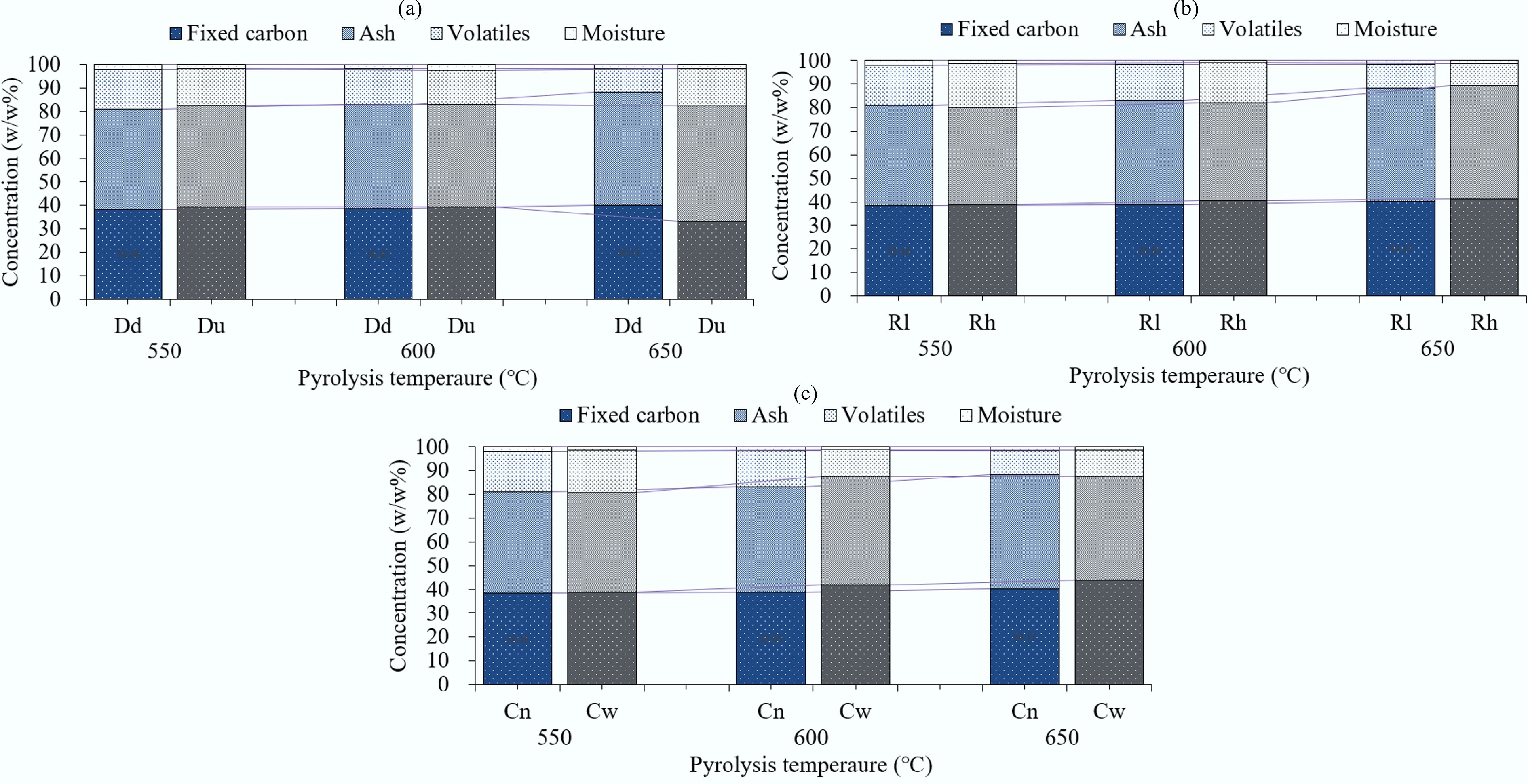 Influence of (a) draft direction, (b) air distribution rate, and (c) cooling type on the fixed carbon and ash contents of biochar. Dd: downdraft condition, Du: updraft condition, Rl: low air distribution rate, Rh: high air distribution rate, Cn: air insulation, Cw: water cooling.
