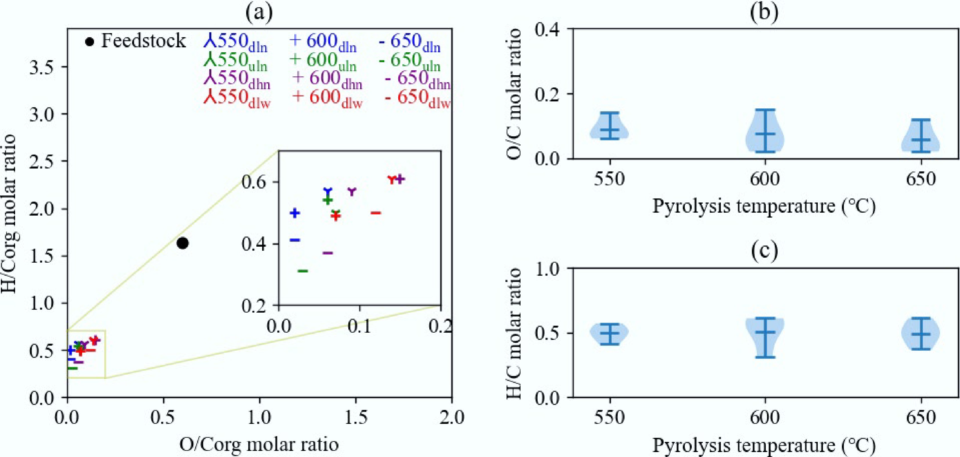 As shown in Fig. 3, a van Krevelen diagram was adopted to evaluate the quality of biochar carbonisation. The O/C and H/C atomic ratios of biochars produced under different pyrolysis conditions were 0.61–0.33 and 0.15–0.03, respectively. Like the fixed carbon concentration, the atomic ratios did not decrease as the pyrolysis temperature rose from 550 via 600 to 650 °C. The H/C molar ratio characterizes the performance of slow biomass pyrolysis, and 0.7 is regarded as the upper limit of the H/C molar ratio to ensure that biochar is suitable for carbon sequestration[23]. A low O/C molar ratio means stable carbon, and a ratio below 0.2 indicates an estimated half-life > 1,000 years[24]. The results indicated that long half-lives were expected for all biochars in this study, which would benefit carbon sequestration[25].