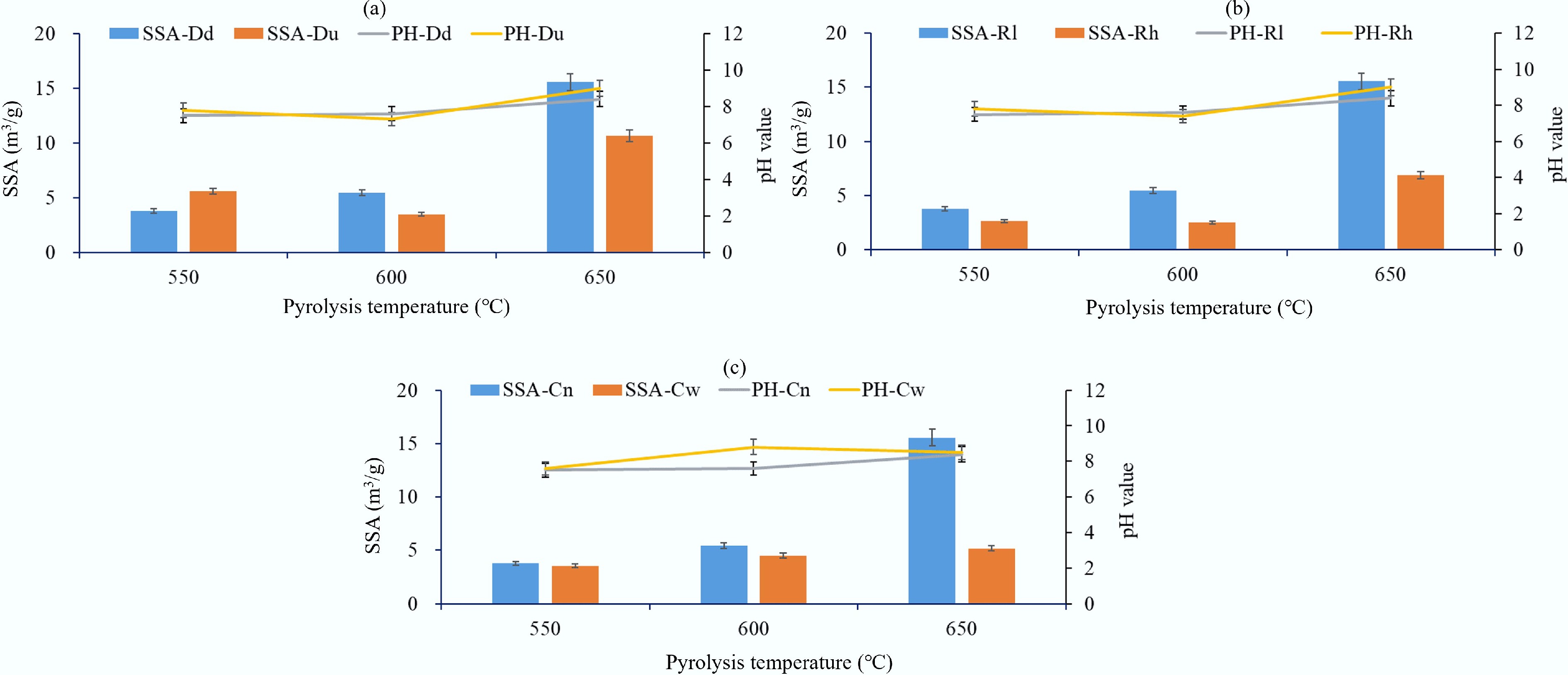 Influence of (a) draft direction, (b) air distribution rate, and (c) cooling type at different pyrolysis temperatures on the specific surface area (SSA) and pH of biochar. Dd: downdraft condition, Du: updraft condition, Rl: low air distribution rate, Rh: high air distribution rate, Cn: air insulation, Cw: water cooling.