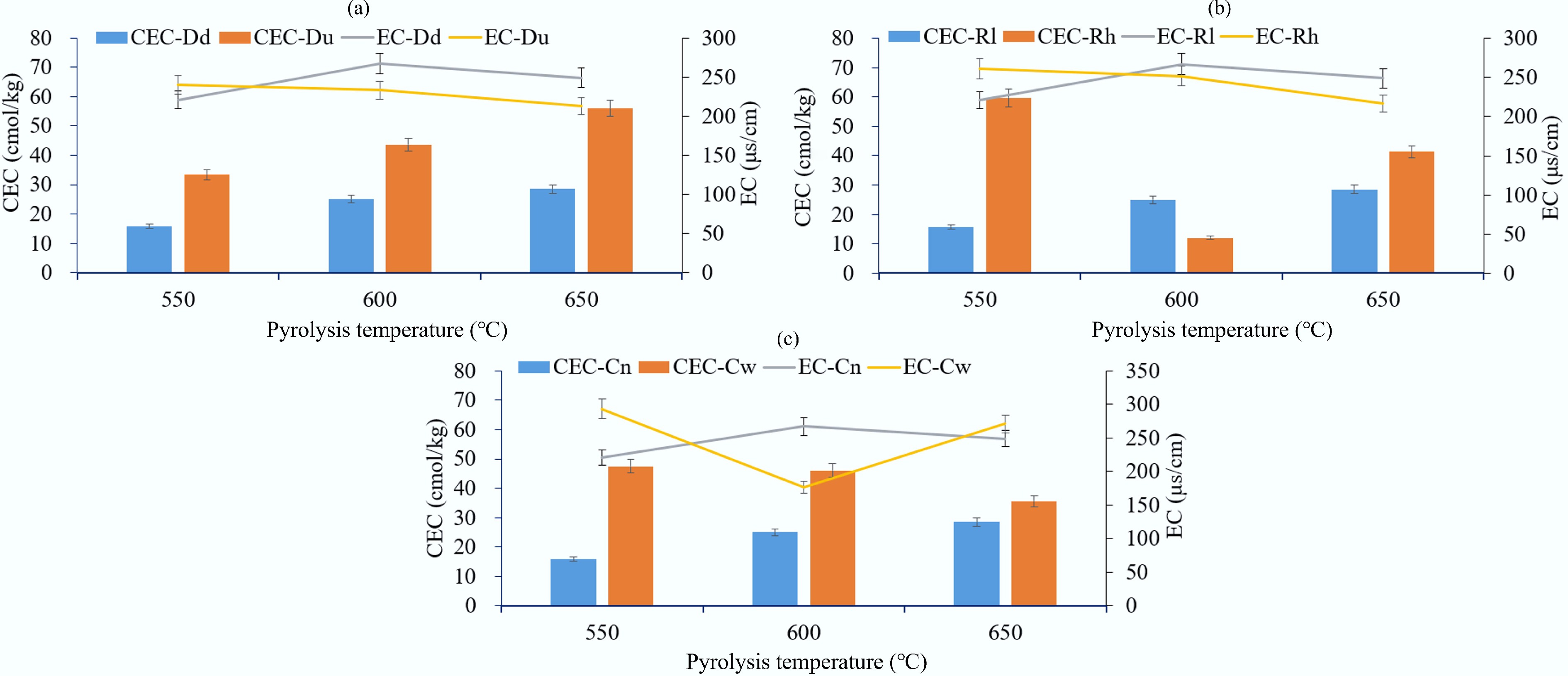 Influence of (a) draft direction, (b) air distribution rate, and (c) cooling type at different pyrolysis temperatures on the cation exchange capacity (CEC) and electrical conductivity (EC) of biochar. Dd: downdraft condition, Du: updraft condition, Rl: low air distribution rate, Rh: high air distribution rate, Cn: air insulation, Cw: water cooling.
