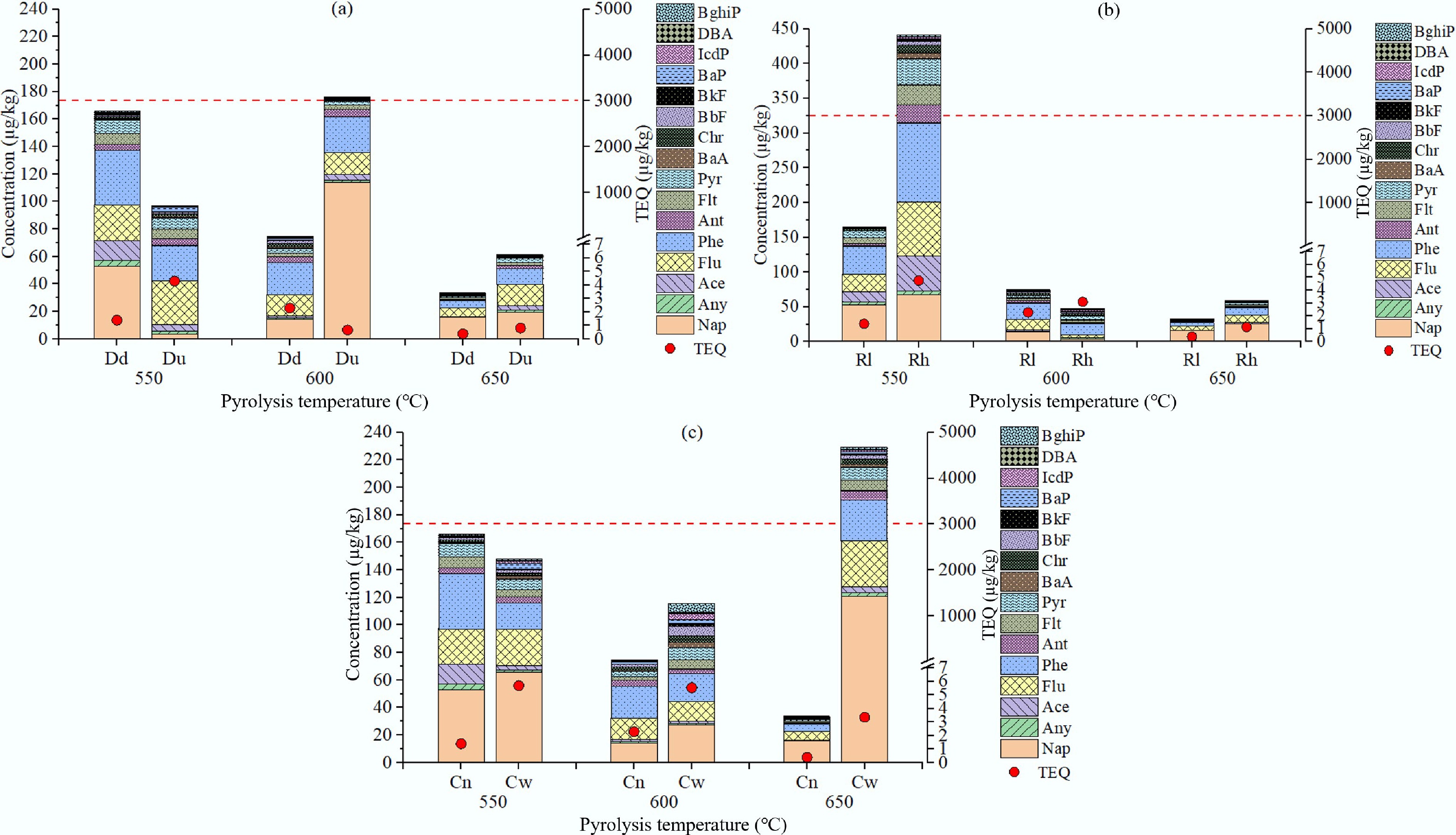 The TEQ ranged from 0.39 to 5.68 µg/kg (Fig. 6), which was far below the IBI threshold (3 mg/kg) for biochar[33], indicating the premium cleanliness of the biochars obtained in this study. The variation in TEQ values according to different pyrolysis conditions was similar to the PAH concentration.