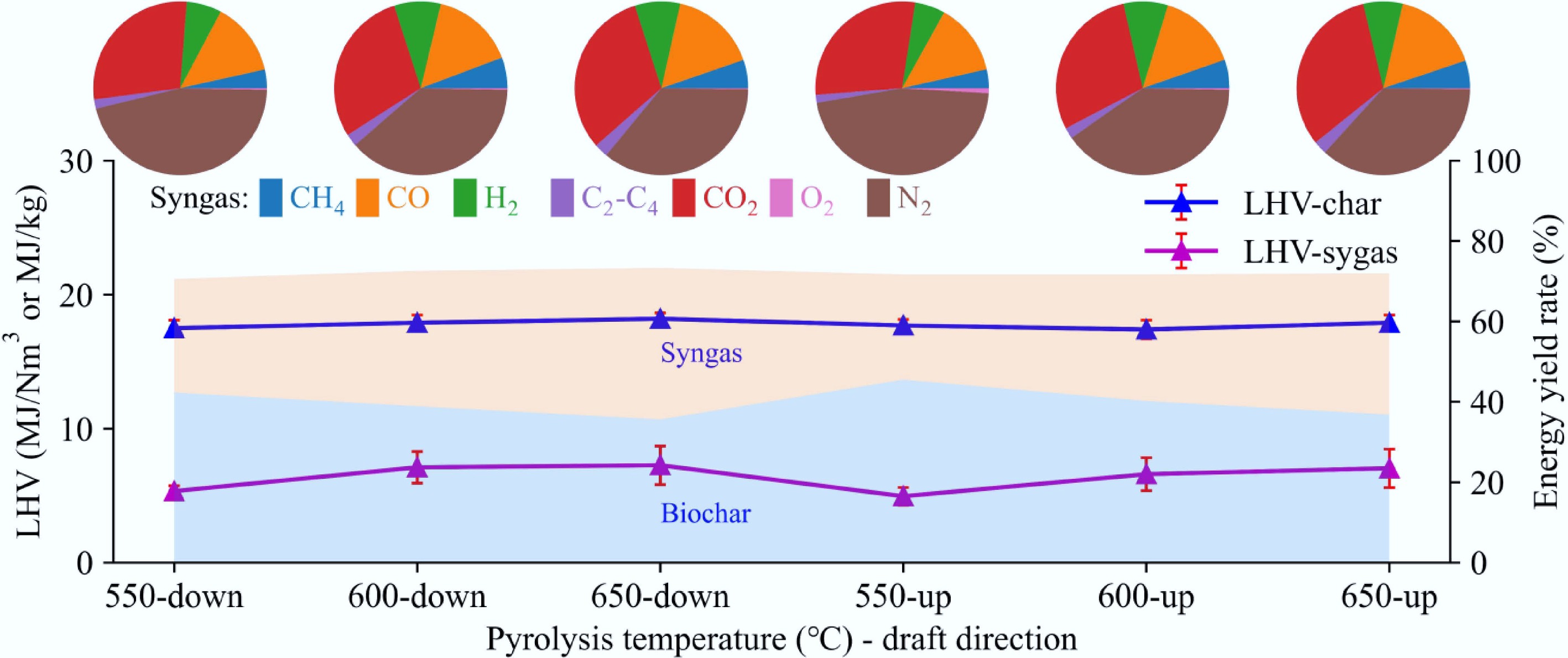 Low heating value and energy distribution of biochar and syngas under different pyrolysis conditions.