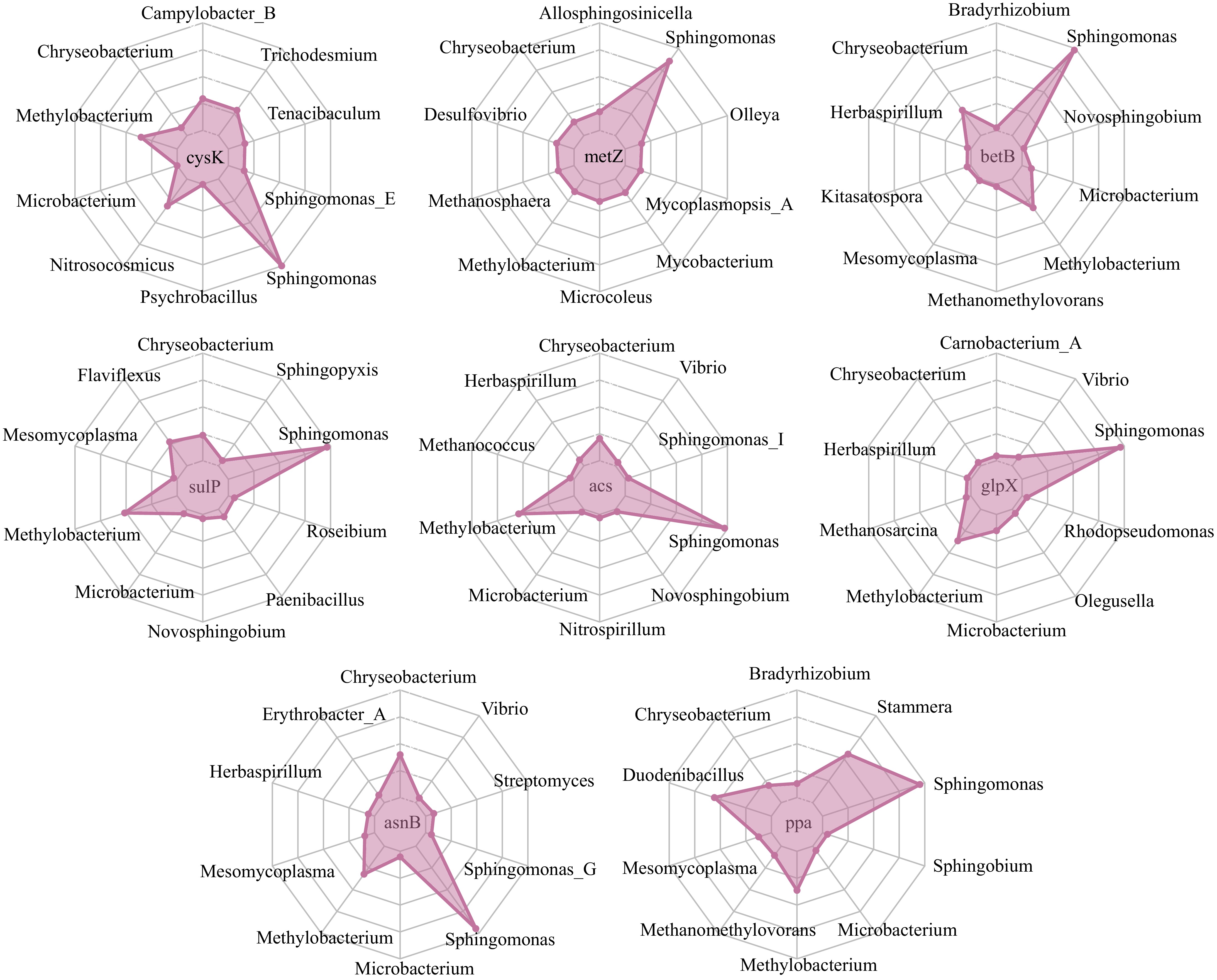 Next, we analyzed the microbial taxa that harbored the eight functional genes that were linked to leaf metabolites through random forest analysis (Fig. 6). Notably, three genera Sphingomonas, Methylobacterium, and Chryseobacterium harbored all eight genes. Besides, Sphingomonas was the most important source of all eight genes (Fig. 6), indicating its vital role in the functional composition of the tea leaf microbiome.