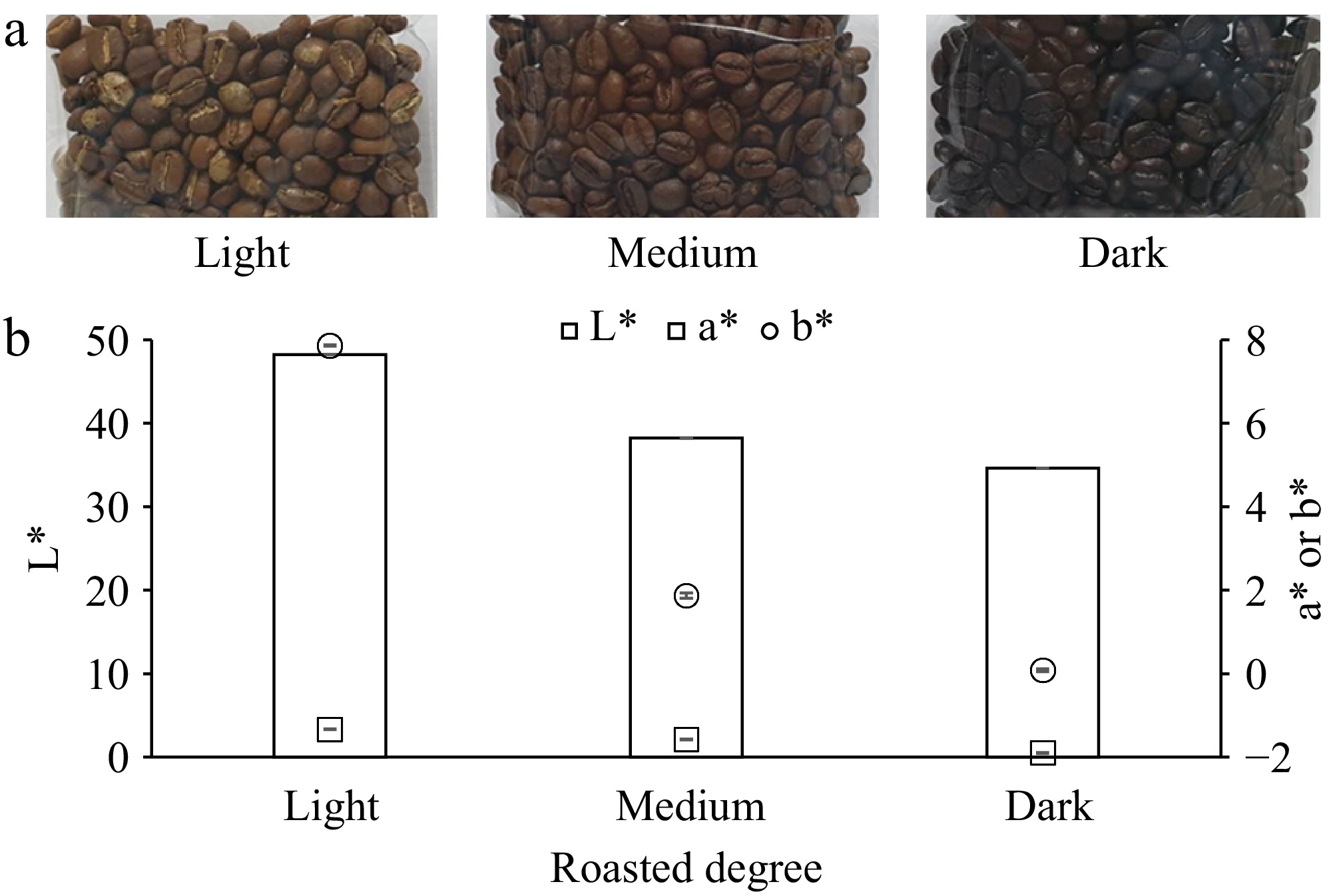 Arabica coffee beans cultivated, harvested, and processed by a local farm allocated in Doi Chang, Chiang Rai, Thailand (Latitude: 19°49'3" N; Longitude: 99°33'28" E; Elevation: 1,074 m) were studied. The beans were roasted for 15−20 min at different temperatures to give light (180 °C), medium (200−220 °C), and dark (230 °C) roasts. Bean colour was recorded in terms of color parameters (CIELAB), which are L*, a*, and b* by a colorimetric spectrophotometer (UltraScan Vis, HunterLab, USA)[15].