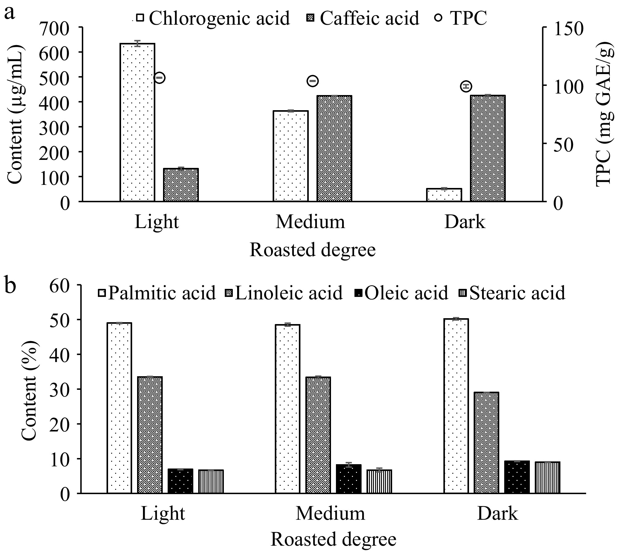 Correlation (r) TPC Chlorogenic acid Caffeic acid Palmitic acid Linoleic acid Oleic acid Stearic acid L* +0.8434 +0.9101 −0.9360 −0.7515 +0.5159 −0.9568 −0.5133 TPC +0.9896 −0.6216 −0.9868 +0.8742 −0.9615 −0.8724 Chlorogenic acid −0.7177 −0.9535 +0.7989 −0.991 −0.7968 Caffeic acid +0.5078 −0.2693 +0.7989 +0.267 Different roasting processes are crucial for the quality of coffee, and chlorogenic acid is regarded as a biomarker of coffee[4,24,27] in addition to its volatile profiles[28]. Accordingly, the key phenolic of coffee, chlorogenic acid, was subjectively examined, including its degradation compound, i.e., caffeic acid.