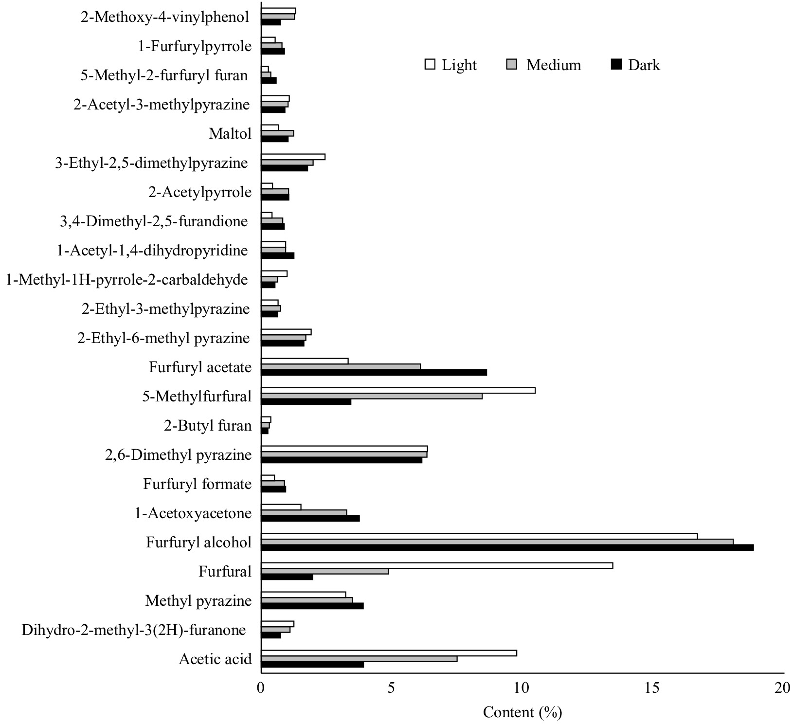 The Millard reaction was escalated with increasing level of roasting. Maltol, with a sweet, caramelized odour, was highest in the dark roast, followed by the medium and light roasts. Acetic acid content was sharply decreased with increasing roasting levels, as was 1-methyl-1H-pyrrole-2-carbaldehyde (sweet, burnt notes), while the contents of 1-acetoxyacetone (fruity, buttery, nutty odours), 2-acetyl pyrrole (walnut, roast odours), and 1-furfuryl pyrrole (waxy, fruity, coffee odours) increased.