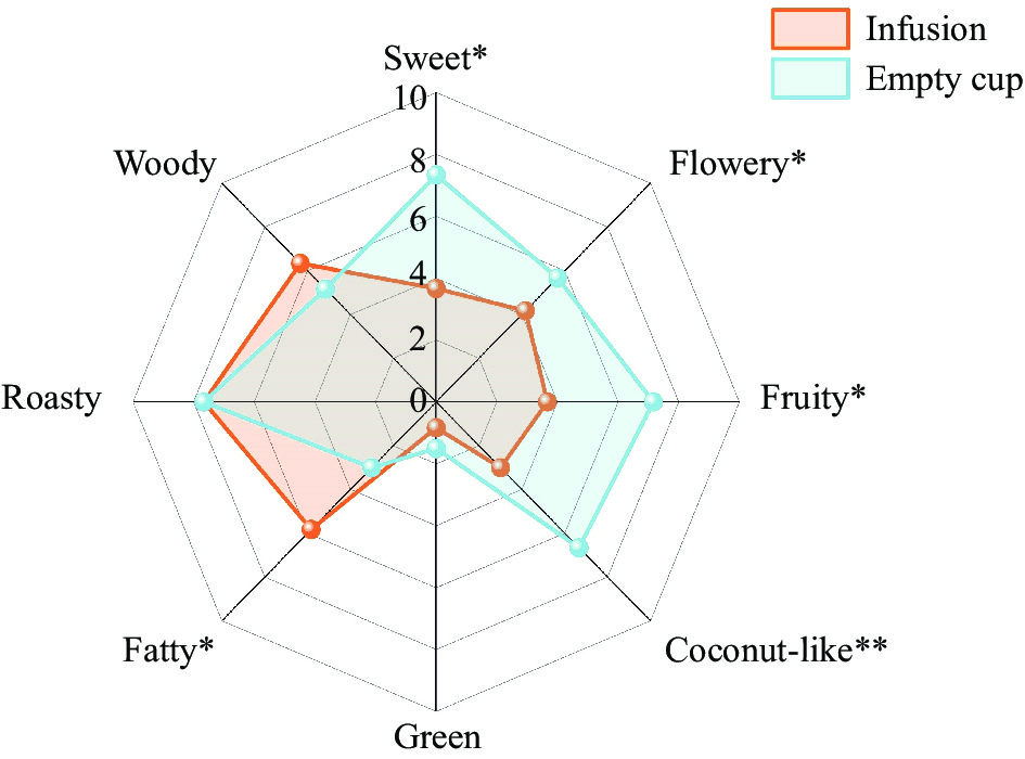 Overall aroma profiles of the infusion (orange color) and the empty cup (blue color) of 'Dahongpao' tea. Odor notes with * means significantly different (p < 0.05), ** means extremely different (p < 0.01), and without * means not significantly different (p > 0.05).