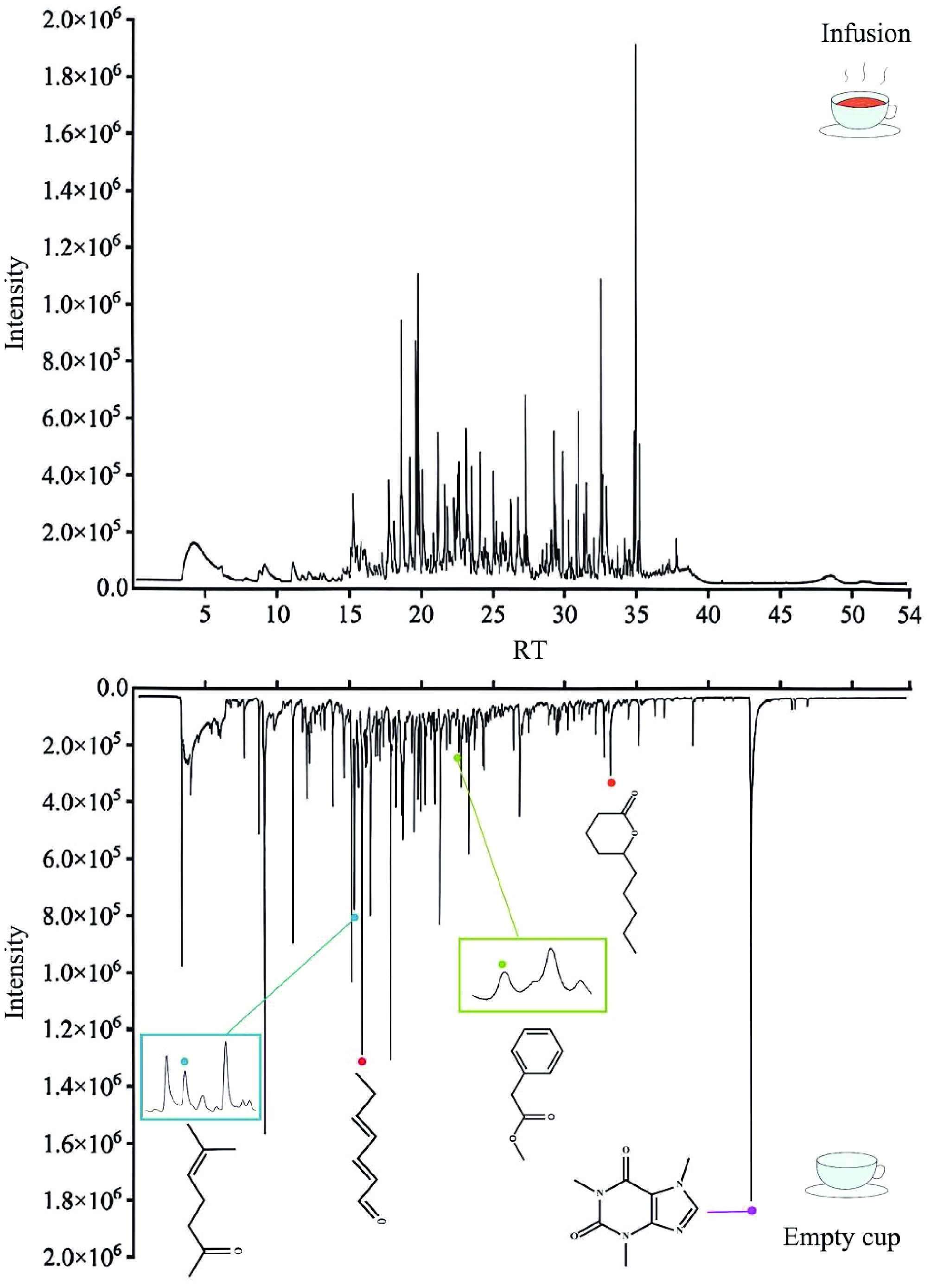 • The odorants in both the tea infusion and the empty cup fractions were determined by GC-O/MS. Odorants were identified by comparing the following information including the retention indices (RIs), the odour quality and intensity perceived by GC-O, and the mass spectrum with the corresponding reference compounds. Thereby, a total of 48 aroma-active regions were unambiguously detected in the aroma intensity (AI) factor range of 1 to 3. 39, and 37 aroma-active compounds were detected in the tea infusion and the empty cup, respectively. In accordance with the aroma profile data, a high AI factor between 2 and 3 in either the tea infusion or the empty cup were perceived for fruity and sweet, citrus-like, flowery, coconut-like, and fatty (Table 1).
