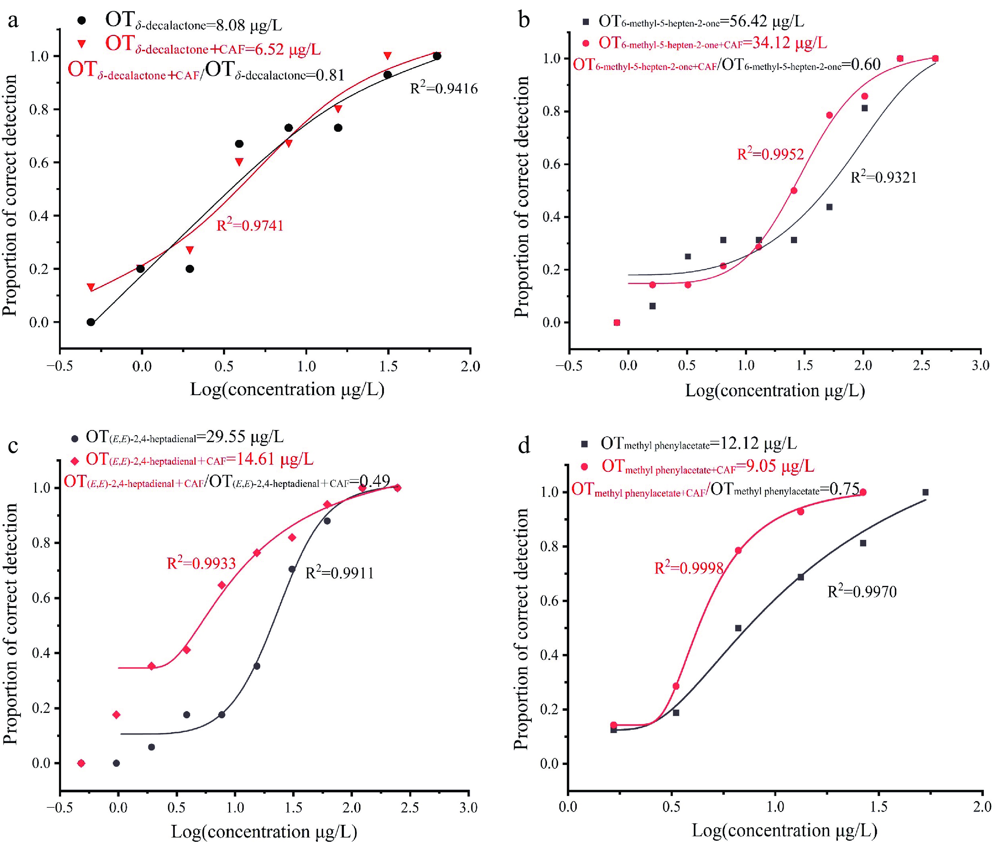 • The odor threshold values of δ-decalactone, 6-methyl-5-heptene-2-one, (E,E)-2,4-heptadienal, and methyl phenylacetate in water and aqueous solution of 638.9 mg/L caffeine were determined by the orthonasal triangle tests, respectively[8]. The sigmoid curve (P = 1/(1 + e − (X − C/D))) was applied to measure the detection thresholds. Here, P was the corrected detection probability, X was the odorant concentration (log μg/L), C represents the olfactory threshold (log μg/L), and D was a specific parameter of each odorant[22]. The detection threshold was defined as the concentration at which there is a 50% chance of detection[23].
