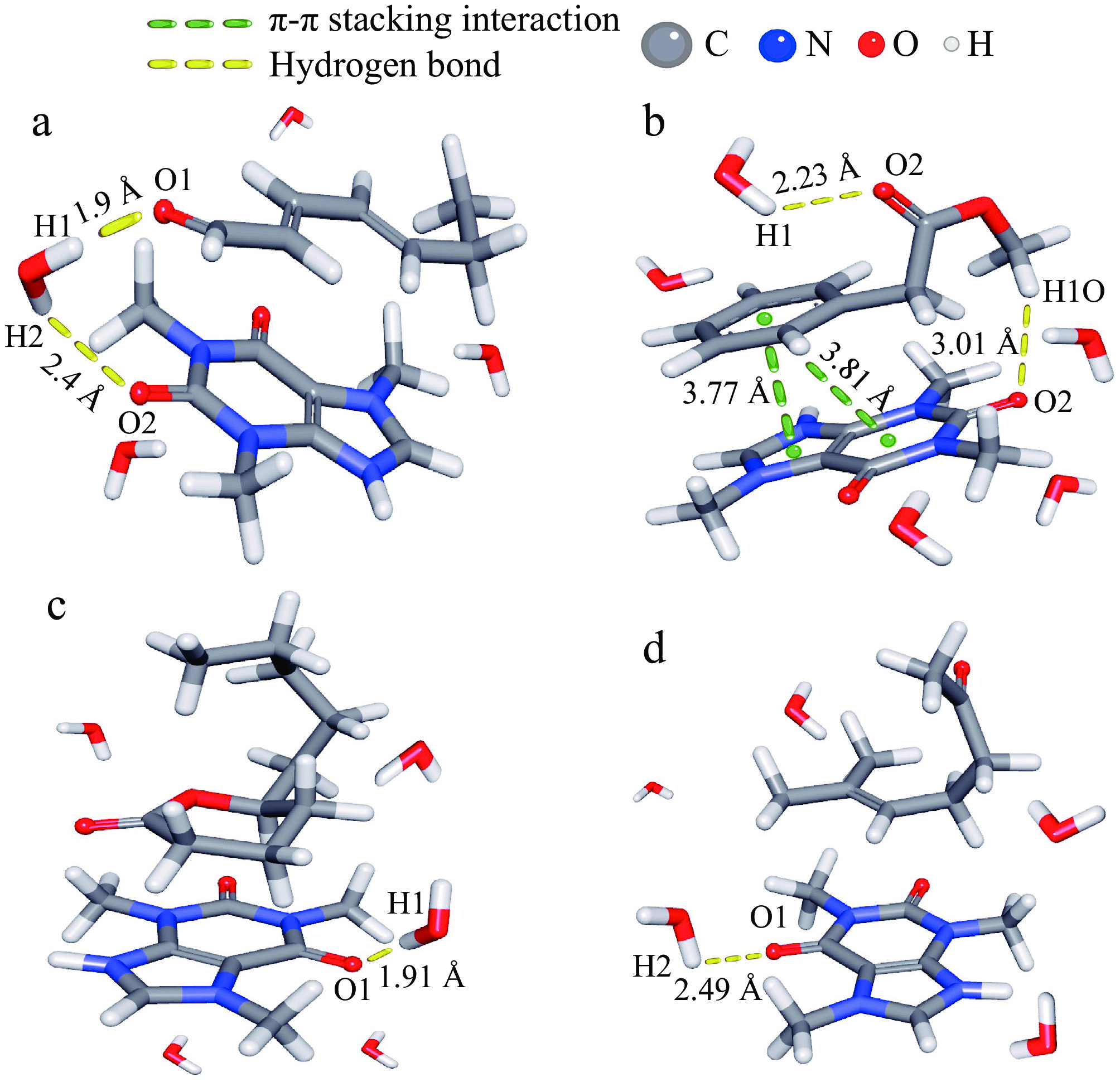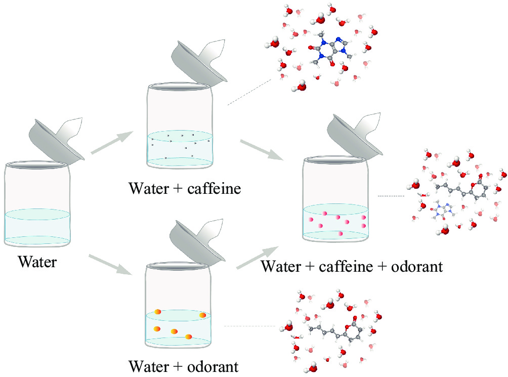 Interactions between four aroma-active compounds, caffeine, and water. (a) (E,E)-2,4-heptadienal, caffeine, and water. (b) Methyl phenylacetate, caffeine, and water. (c) δ -declactone caffeine, and water. (d) 6-Methyl-5-hepten-2-one caffeine, and water.