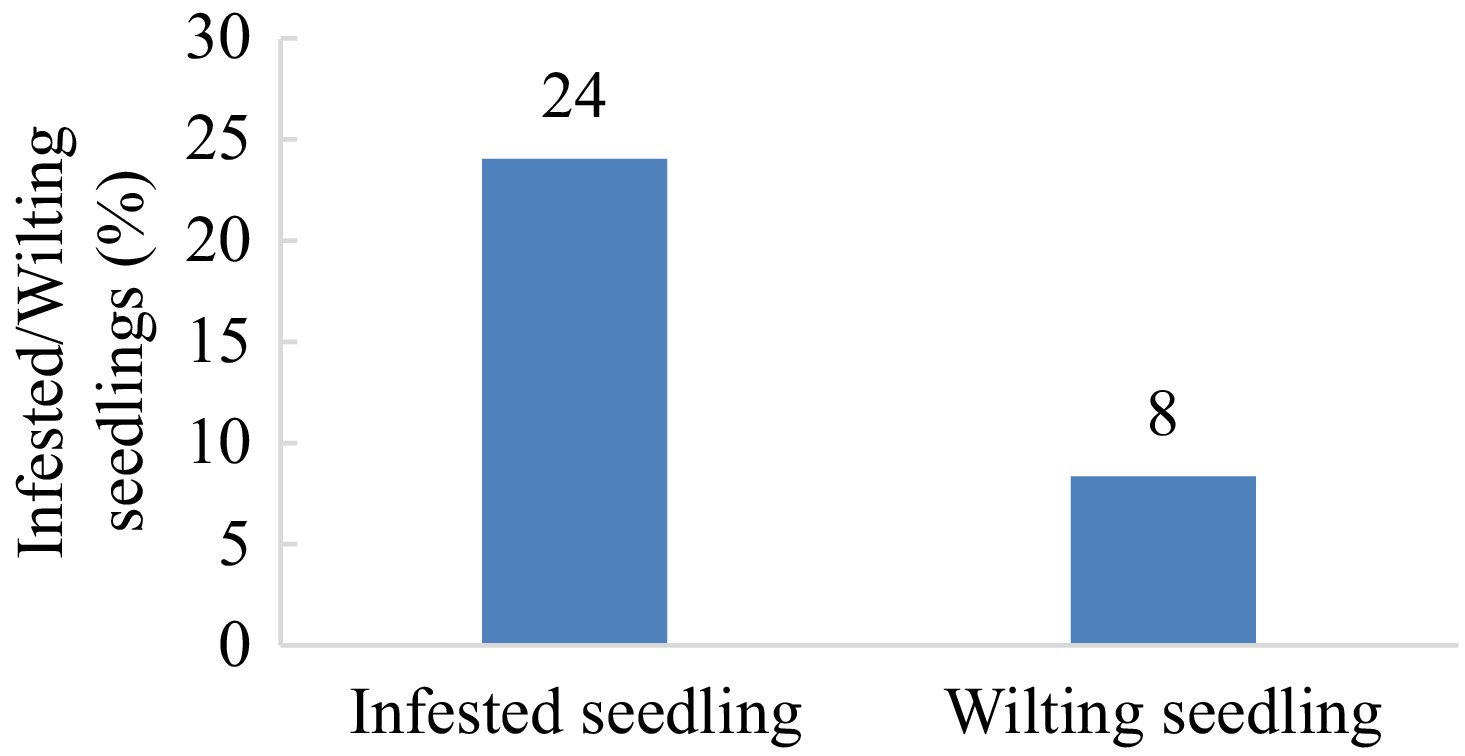 Percentage of infested and wilting cacao seedlings under X. compactus infestation in East Luwu, South Sulawesi, Indonesia.