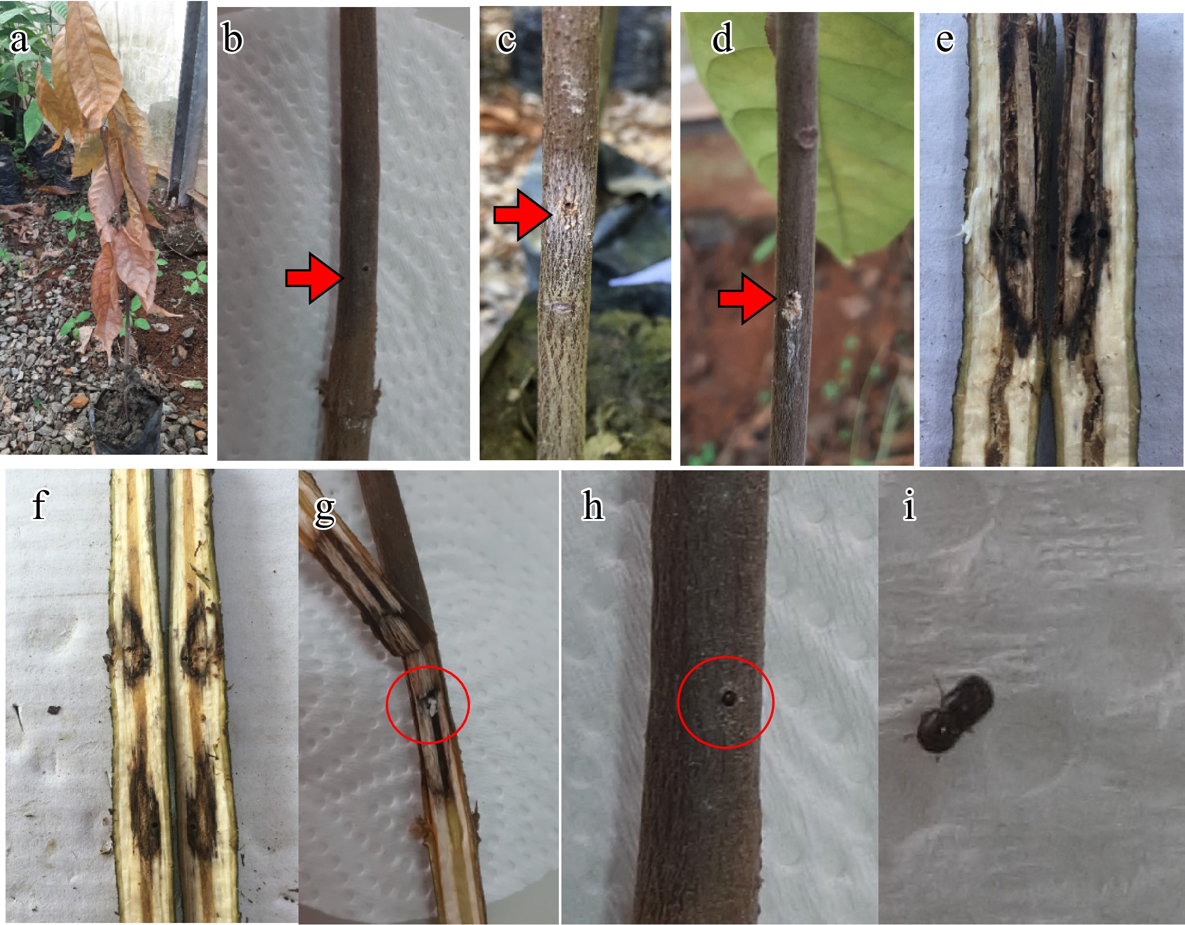 External and internal symptoms of Xylosandrus colonisation on cacao seedlings in East Luwu, South Sulawesi, Indonesia. (a) Decline/wilting seedling. (b) Borehole with dark brown to black lesion around the hole (arrowhead). (c), (d) Borehole with powdery frass (arrowhead). (e), (f) Internal galleries with dark brown to black lesions around the inside holes. (g) Dark brown to black necrotic on wood tissue around the bore hole and internal gallery with a group of larvae inside (red circle). (h) Beetle in entry/exit hole. (i) Beetle.