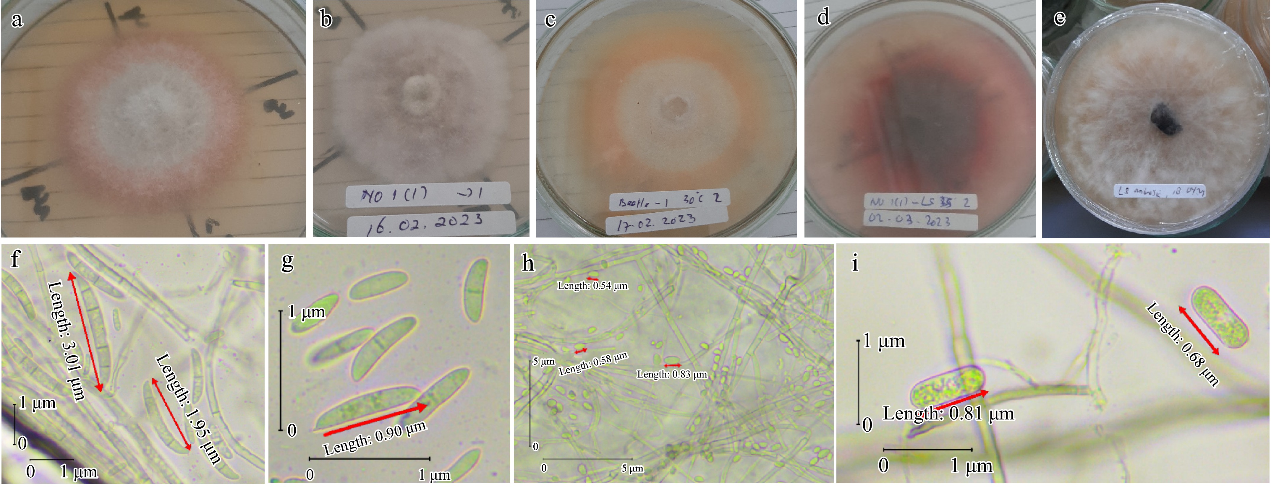 Morphological and conidia features of fungi associated with wilting seedling of cacao. (a) Fusarium sp. colony features after 10 d at 30 °C. (b) Colletotrichum sp. colony features after 12 d at 26–29 °C. (c) Fusarium sp. colony features after 12 d at 30 °C. (d) Lasiodiplodia sp. colony features after 6 d at 35 °C. (e) Lasiodiplodia sp. colony features after 6 d at 26–29 °C. (f) Microconidia (two-celled oval) and macroconidia (typical Fusarium macroconidium; apical cell; blunt; basal cell; foot-shape; four-six cell). (g) Microconidia (oval and two-celled oval) of Fusarium sp. (h) Aseptate, hyaline, subovoid, ovoid, and globose conidia of Colletotrichum sp. (i) Ellipsoid young conidia, hyaline, aseptate, and granular contents of Lasiodiplodia sp.
