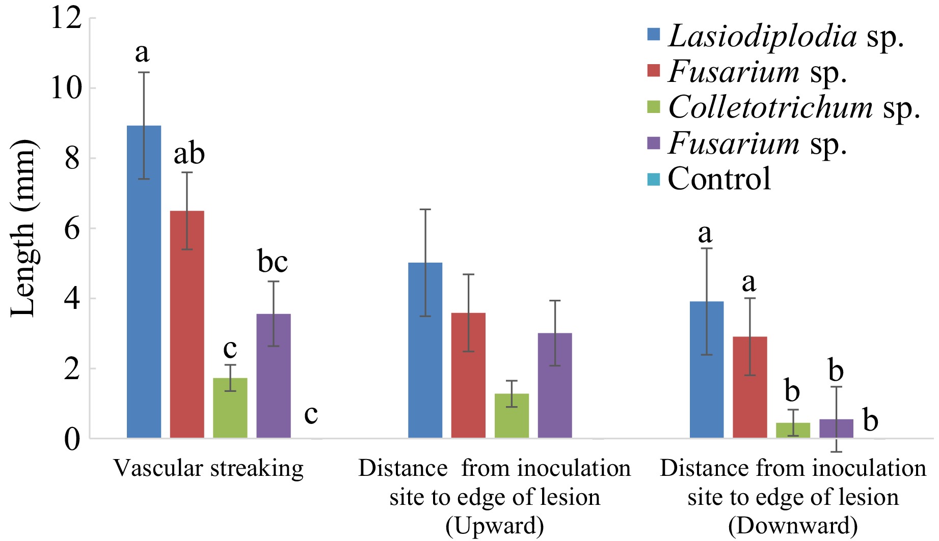 • Pathogenicity tests were performed on 6-month-old rootstock seedlings inoculated with four fungal isolates. The dark brown to black vascular streaking (Fig. 6ac) on inoculated seedlings was measured 95 d after wound inoculation. The vascular streaking length significantly differed in most fungal isolates from the control. Lasiodiplodia sp. caused a longer lesion length of 8.9 mm. However, the lesion length caused by the Lasiodiplodia sp. was not significantly different from that caused by the Fusarium sp. (isolate 1) by 6.5 mm. Meanwhile, the pathogen moved upward and downward from the inoculation site. No dark brown to black vascular streaking was observed on control-treated seedlings. Lasiodiplodia, two isolates of Fusarium, and Colletotrichum isolate were recovered from the treated seedlings but not the control seedlings.
