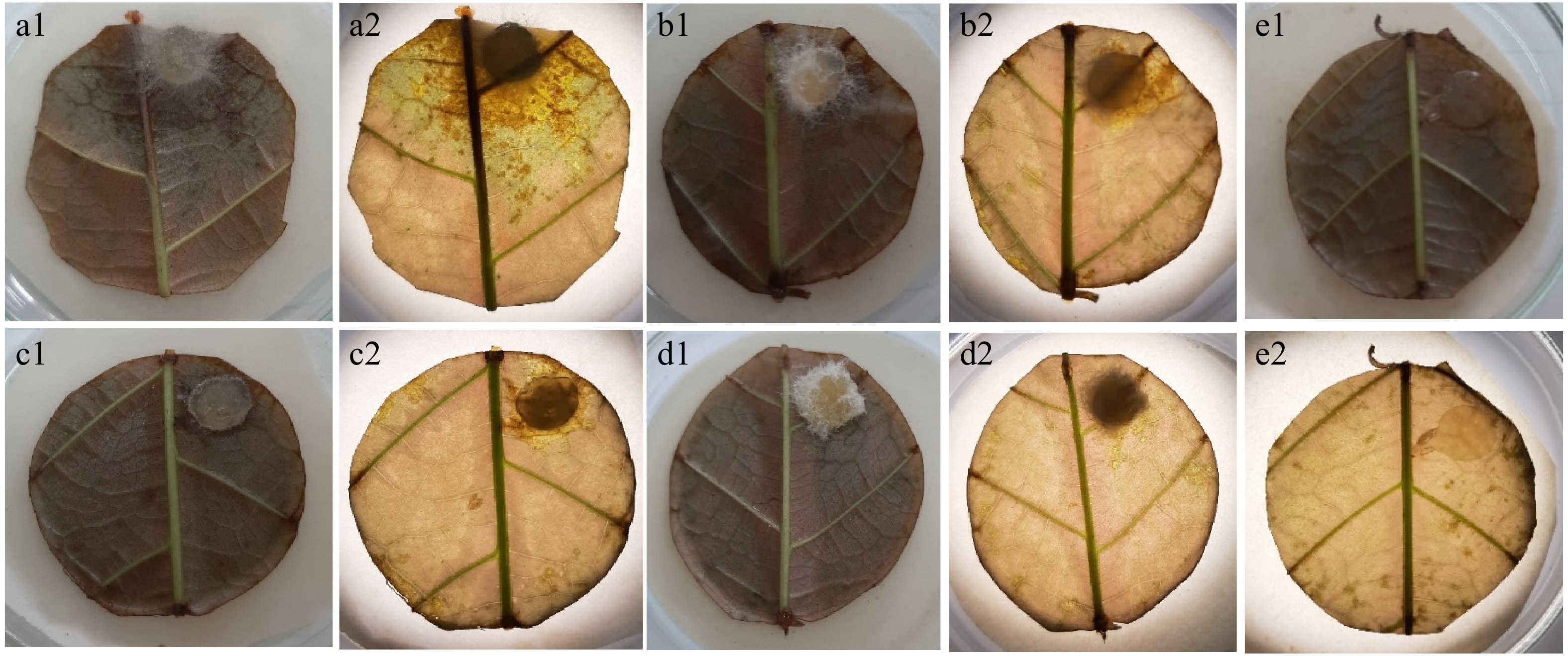 Necrotic lesions on stage 3 leaf disks 48 h after inoculation in the leaf disk bioassay. (a1) Inoculation with Lasiodiplodia isolate; (a2) observed under a microscope. (b1) Inoculation with Fusarium isolate; (b2) observed under a microscope. (c1) Inoculation with Fusarium isolate; (c2) observed under a microscope. (d1) Inoculation with Colletotrichum isolate; (d2) observed under a microscope. (e1) No necrotic lesions obtained on controls treated with sterile PDA agar plugs; (e2) observed under a microscope.
