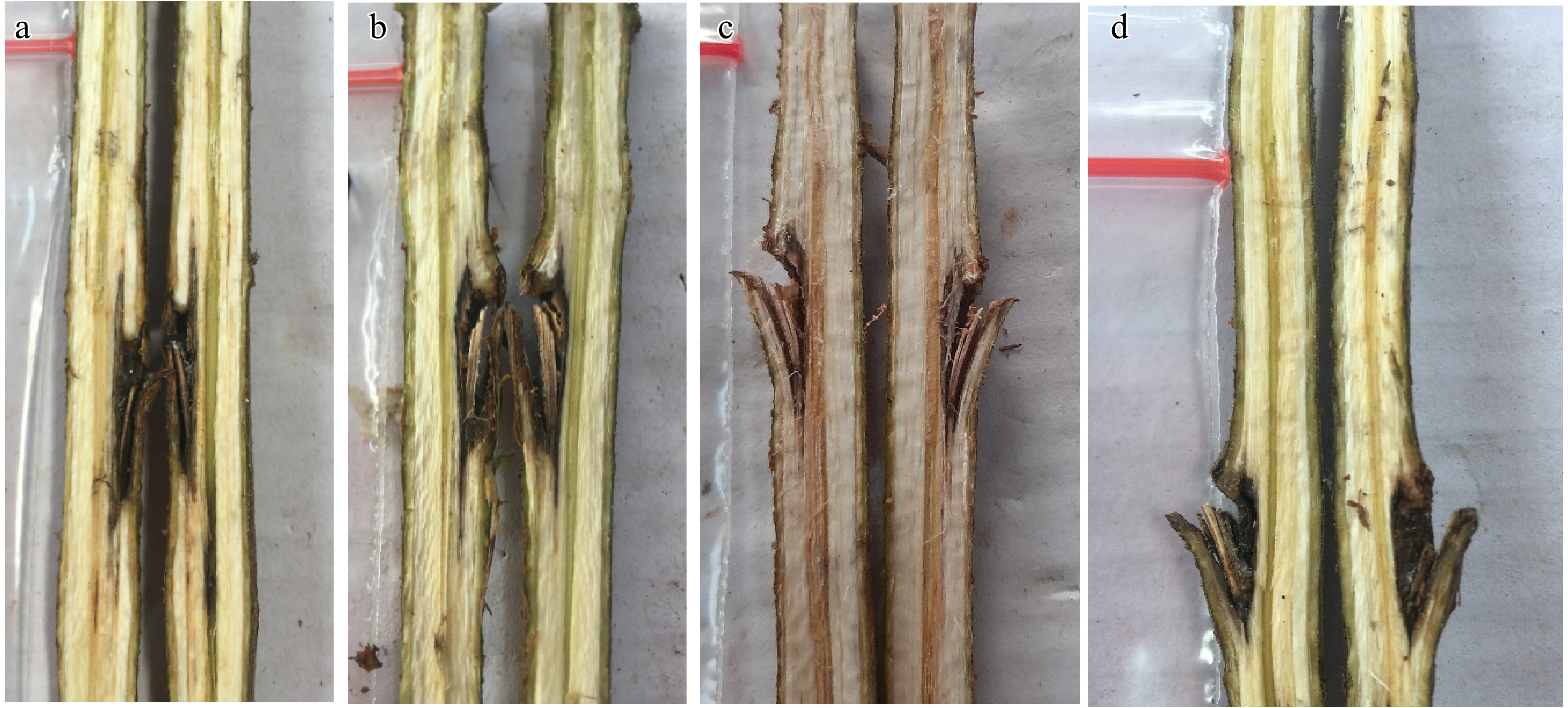 The vertical necrotic section of the fungal inoculated stem showed various sizes of dark brown to black vascular streaking 95 d after inoculation. (a) Lasiodiplodia isolate. (b) Fusarium isolate. (c) Colletotrichum isolate. (d) The vertical section of control showed symptomless/no vascular streaking.