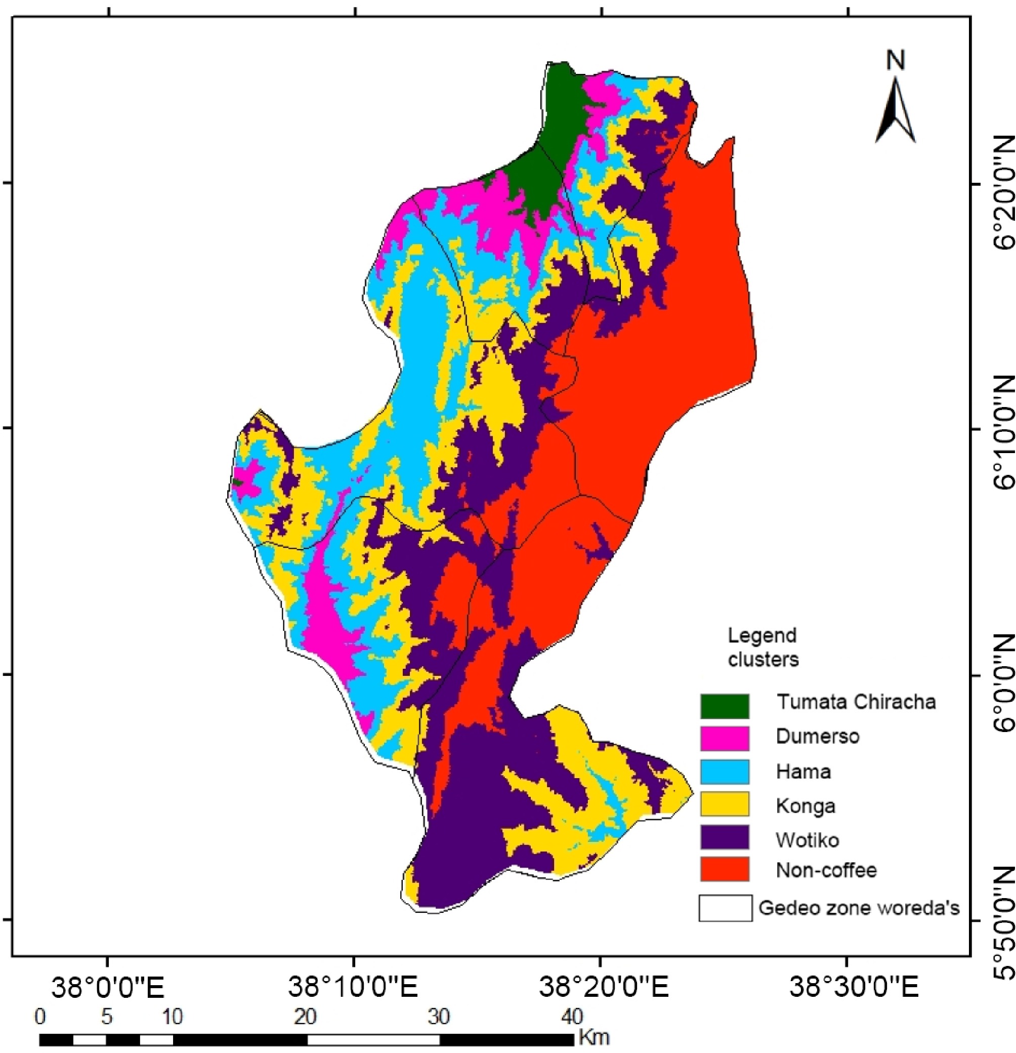 • Climatic, edaphic, biotic, and physiographic factors together with farmers' management decisions consistently affect coffee production scenarios and environments. To understand the Gedeo coffee production environments and design corrective measures, we carried out principal component and cluster analysis of the aforementioned variables. Results of multivariate analysis reduced 58 variables × 18 villages × 10 years to five clusters (Hama, Konga, Dumerso, Wotiko, and Tumata chiracha) explained by only 12 variables (cation exchange capacity, evapotranspiration, number of shade trees, total nitrogen, altitude, ash, organic matter, iron, soil water conservation practices, NDVI, coffee variety, and clay content of soils) with significant reduction in the dimensionality of dataset. The distance between the cluster of centroids was highest (894,814.6) between Tumata chiracha and Wotiko, and lowest (29,212.5) between Hama and Tumata chiracha. The two largest coffee clusters were Hama and Wotiko covering 22.7% and 20.3% of the study area, respectively.