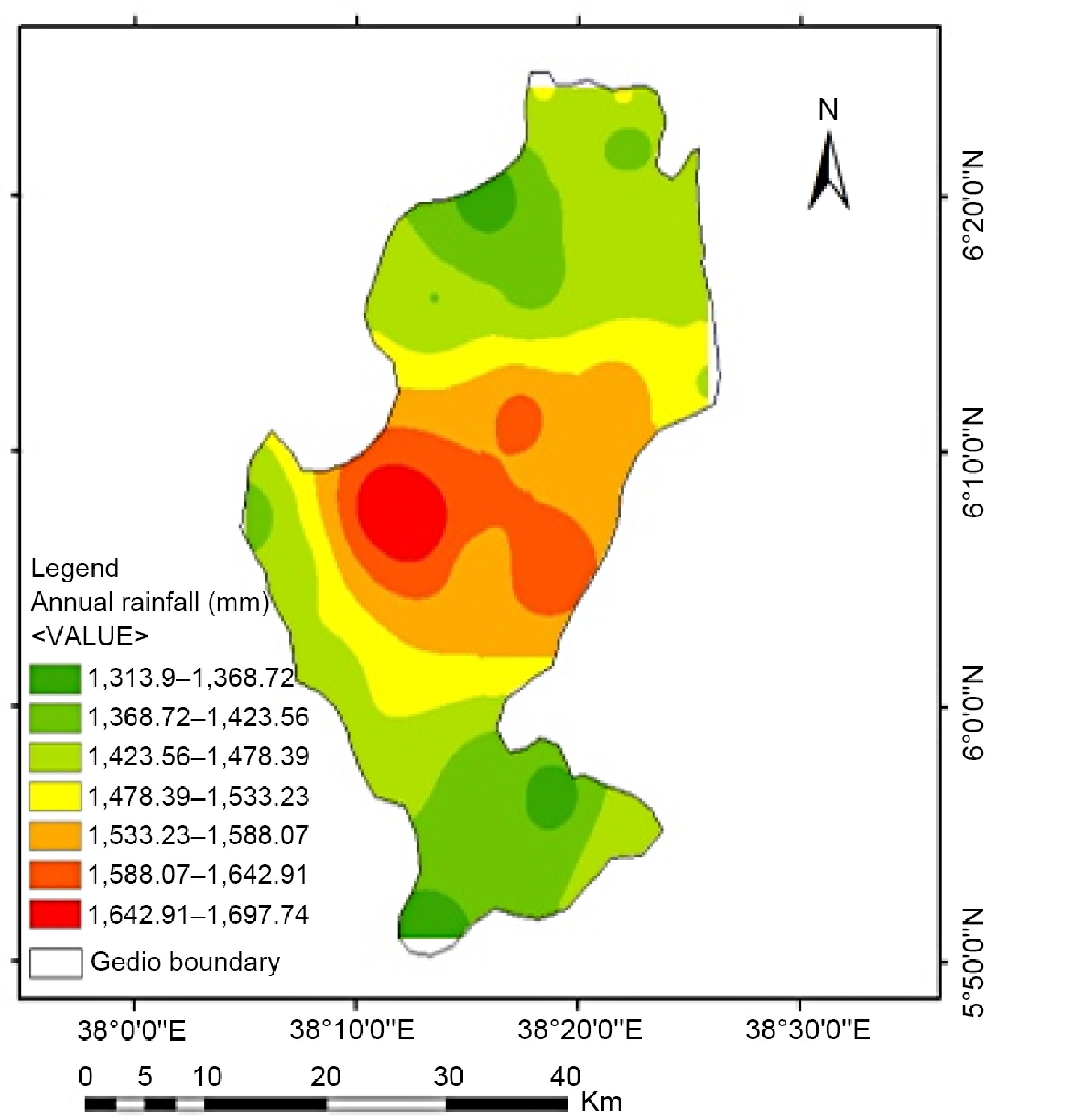 Spatial distribution of total annual rainfall in the Gedeo Zone of southern Ethiopia.