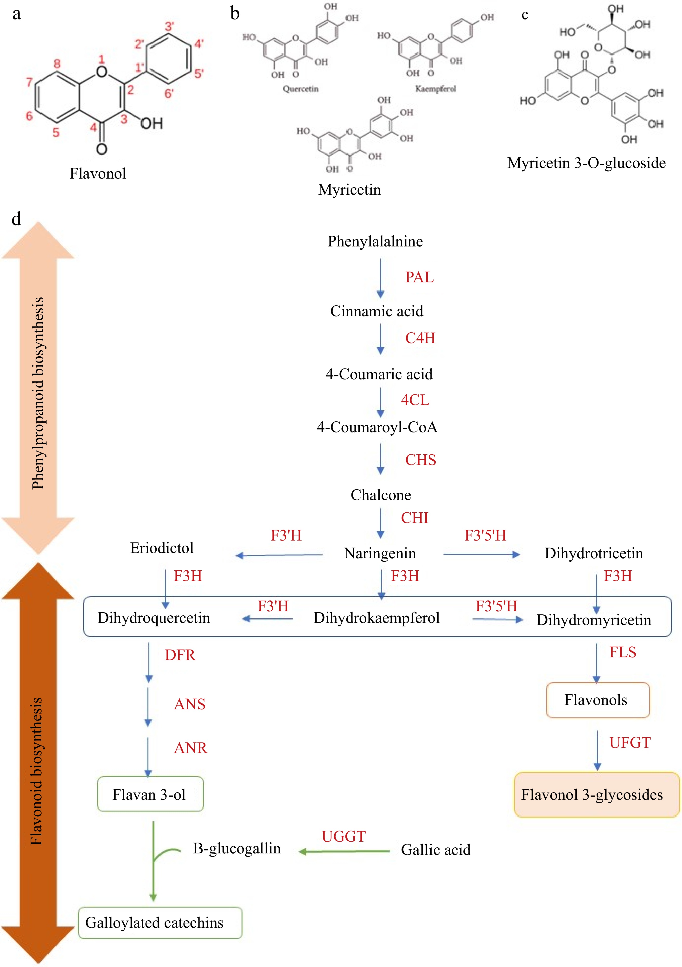 The biosynthesis in tea involves the shikimate, phenylpropanoid, and flavonoid pathways (Fig. 2d). The process begins with L-phenylalanine, which is converted to naringenin by phenylalanine ammonia-lyase (PAL). Naringenin is then transformed into dihydrokaempferol by dihydroflavonol 4-reductase (DFR), and further into kaempferol by flavonol synthase (FLS). Kaempferol acts as a precursor to other flavonols, such as quercetin and myricetin. These are glycosylated by UDP-glucose flavonoid-3-O-glycosyltransferases (UFGTs), forming flavonol glycosides. The UFGT activity is regulated by the CsUGT78A14 and CsUGT78A15 genes[59].