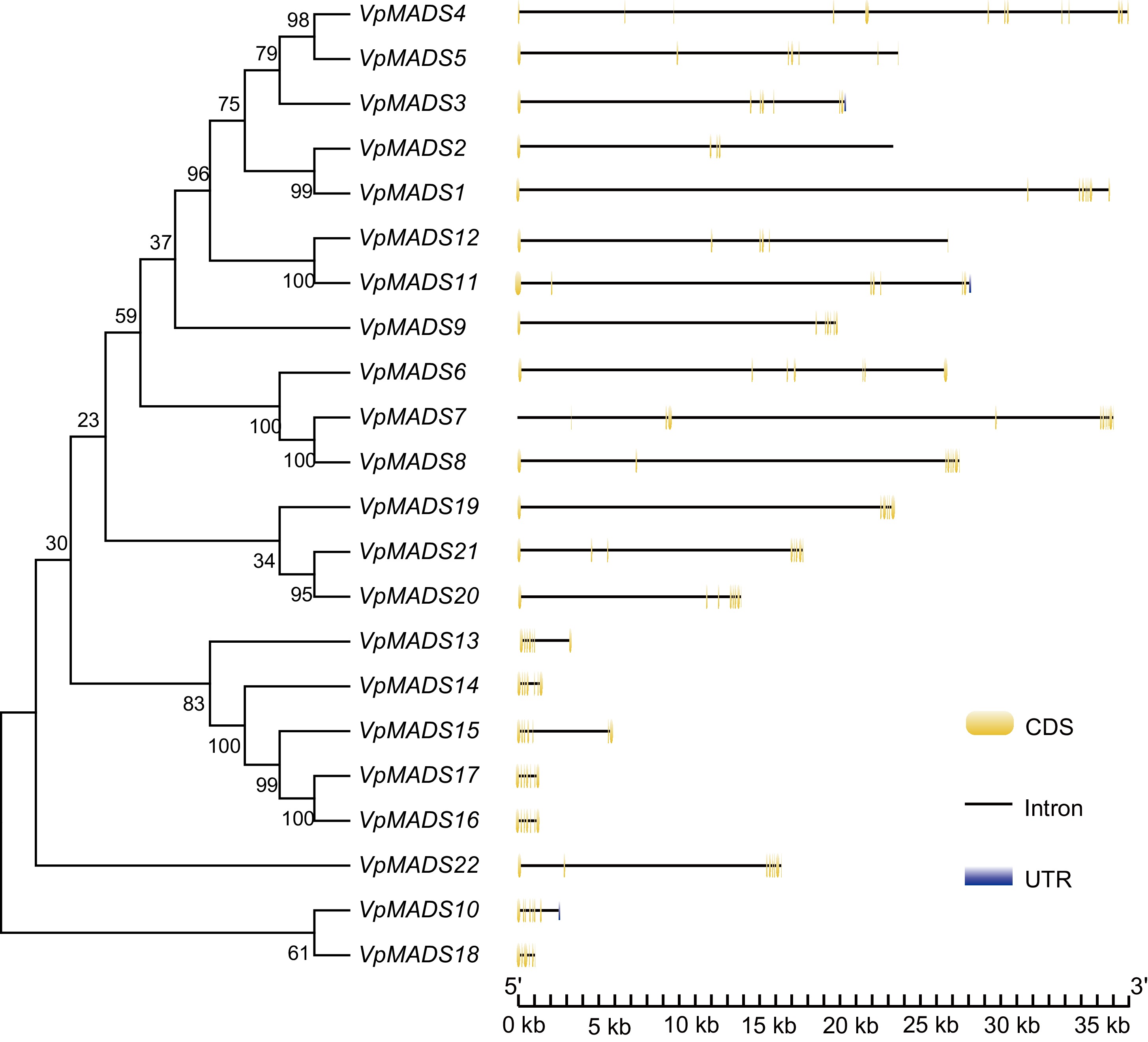 Gene structures of MIKCC-type VpMADS genes with exons, introns, and UTRs.