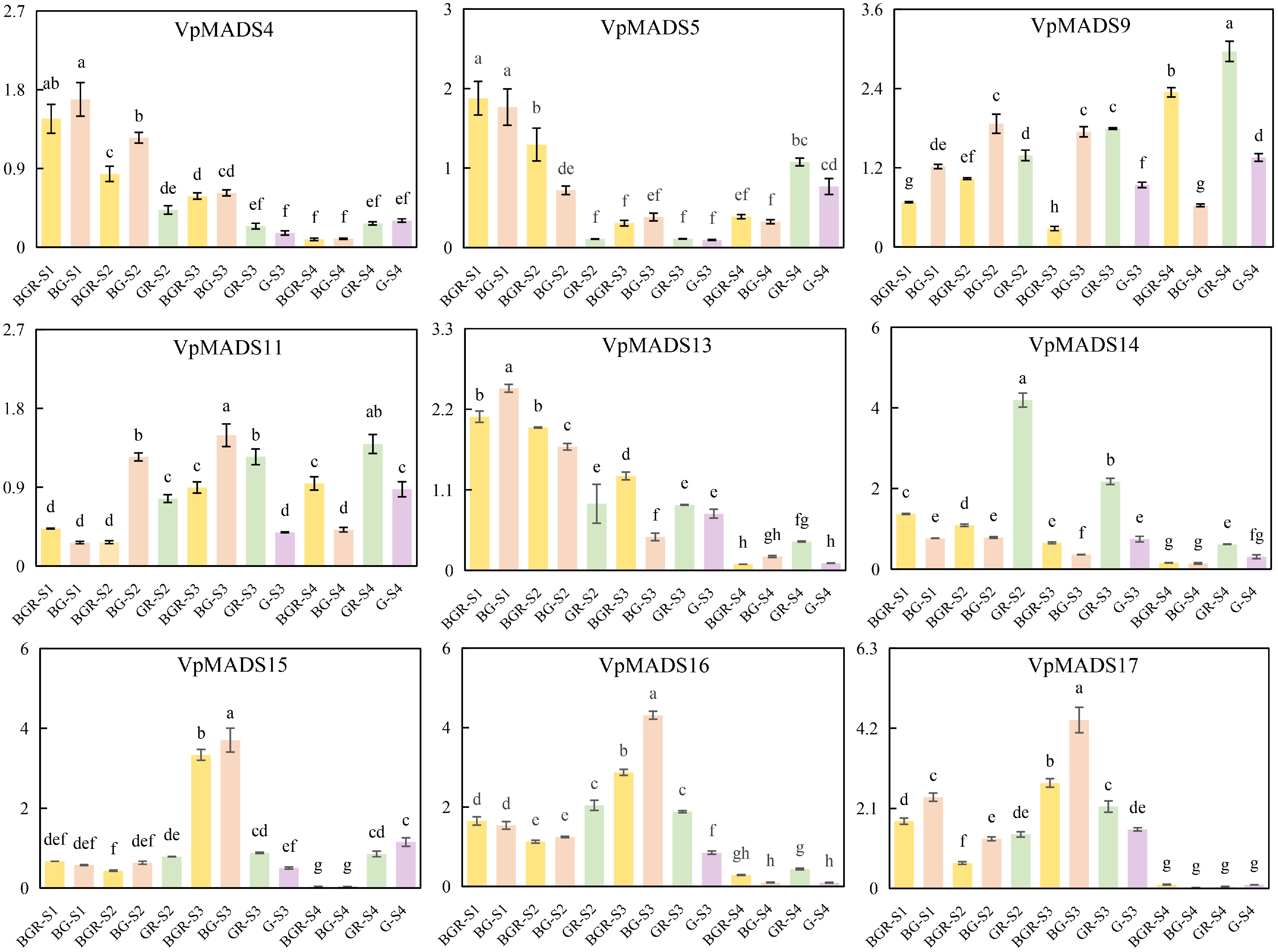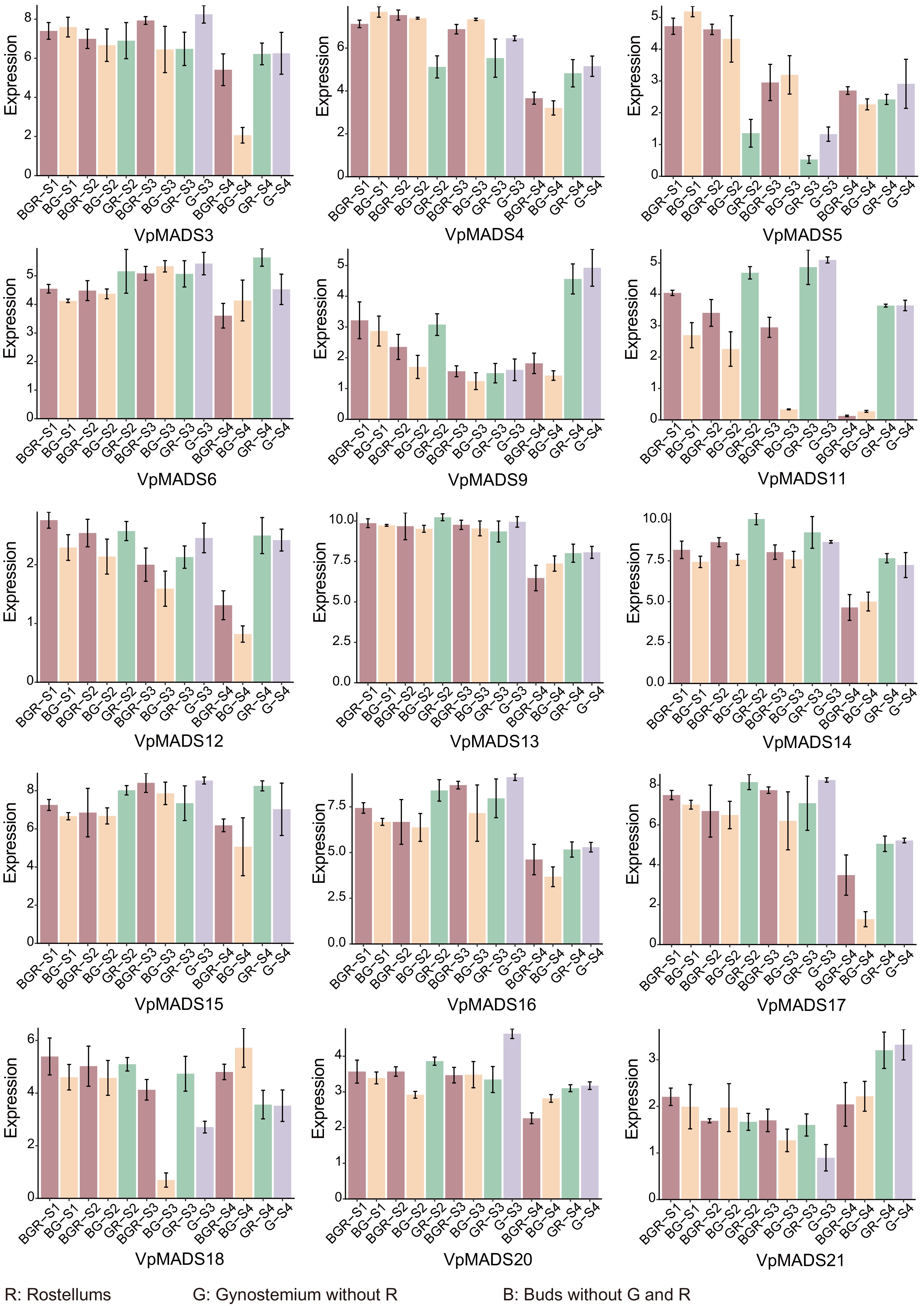 Based on the RNA-seq results, 15 genes with differential expression profiles were obtained, as depicted in Fig. 6. The expression levels of VpMADS3, VpMADS4, VpMADS5, VpMADS11, VpMADS12, VpMADS13, VpMADS14, VpMADS16, and VpMADS17 in BGR exhibited a significant decrease from the S1 to S4 phase, particularly prominent in the S4 stage (Fig. 6). In contrast, the expressions of VpMADS9, and VpMADS21 displayed an opposite tendency, showing an evident up-regulated expression profile in the S4 stage. The expression profiles of most genes were comparable in both GR and G, yet significantly differed from that in BG (VpMADS9, VpMADS11, VpMADS14, VpMADS17). In numerous instances, there was no significant difference in expression between BG and BGR; nevertheless, certain genes, such as VpMADS3, VpMADS11, VpMADS17, and VpMADS18 were remarkably differentially expressed in specific stages between BG and BGR (Fig. 6).