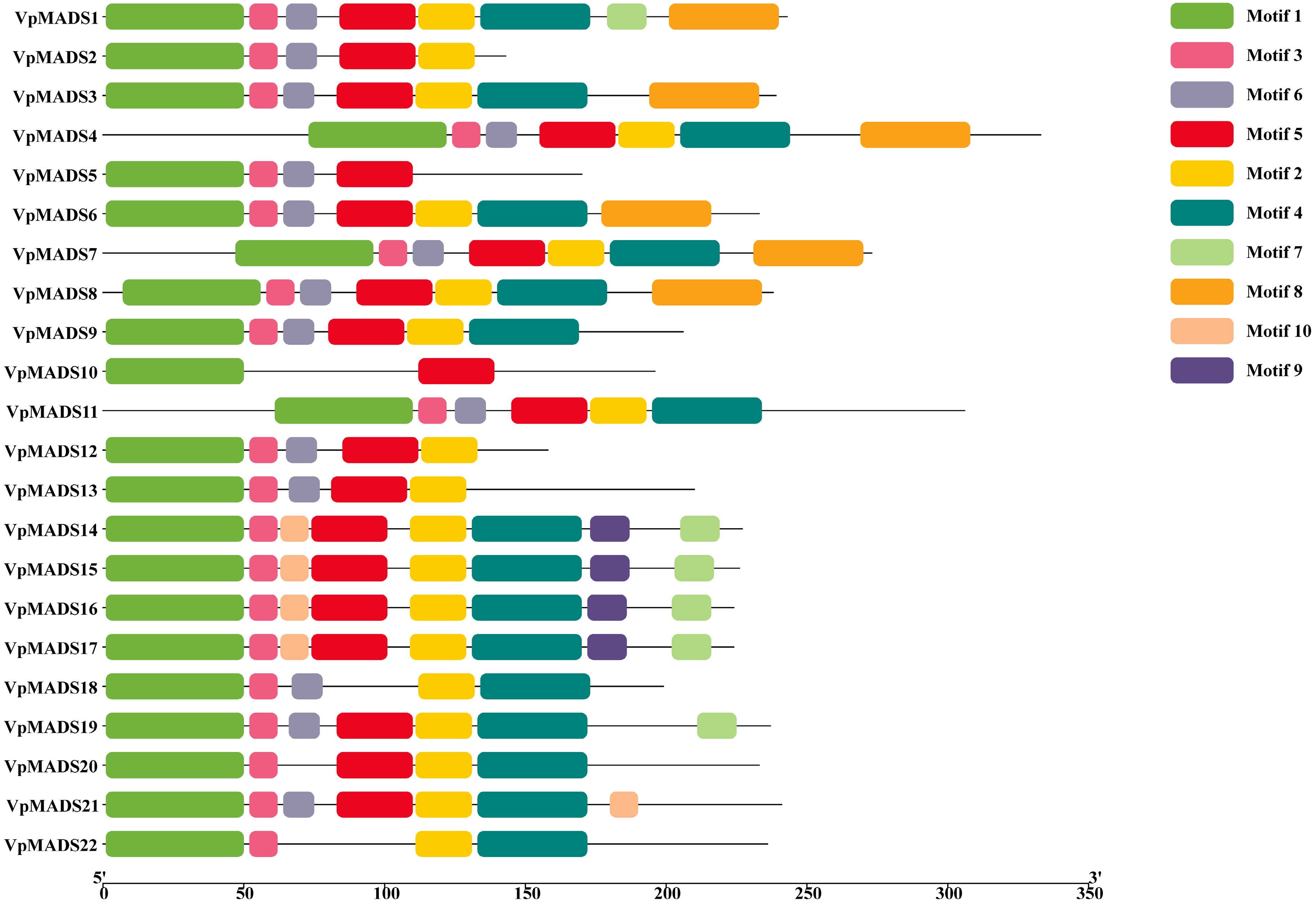 Conserved motif analysis was carried out using The MEME suite (https://meme-suite.org/meme/), and the results are presented in Fig. 2. Among the top 10 motifs, all VpMADSs encompassed motif 1, within which the MADS conserved domain was situated. Nearly all VpMADSs contained motif 3, except VpMADS10. Both motif 2 and motif 5 were present in 20 MIKCC-type VpMADSs, where VpMADS5 and VpMADS10 lacked motif 2, and VpMADS18 and VpMADS22 lacked motif 5 (Fig. 2). Additionally, VpMADSs possessing similar conserved motifs might have comparable functions, as exemplified by VpMADS14, VpMADS15, VpMADS16, and VpMADS17 (Fig. 2).