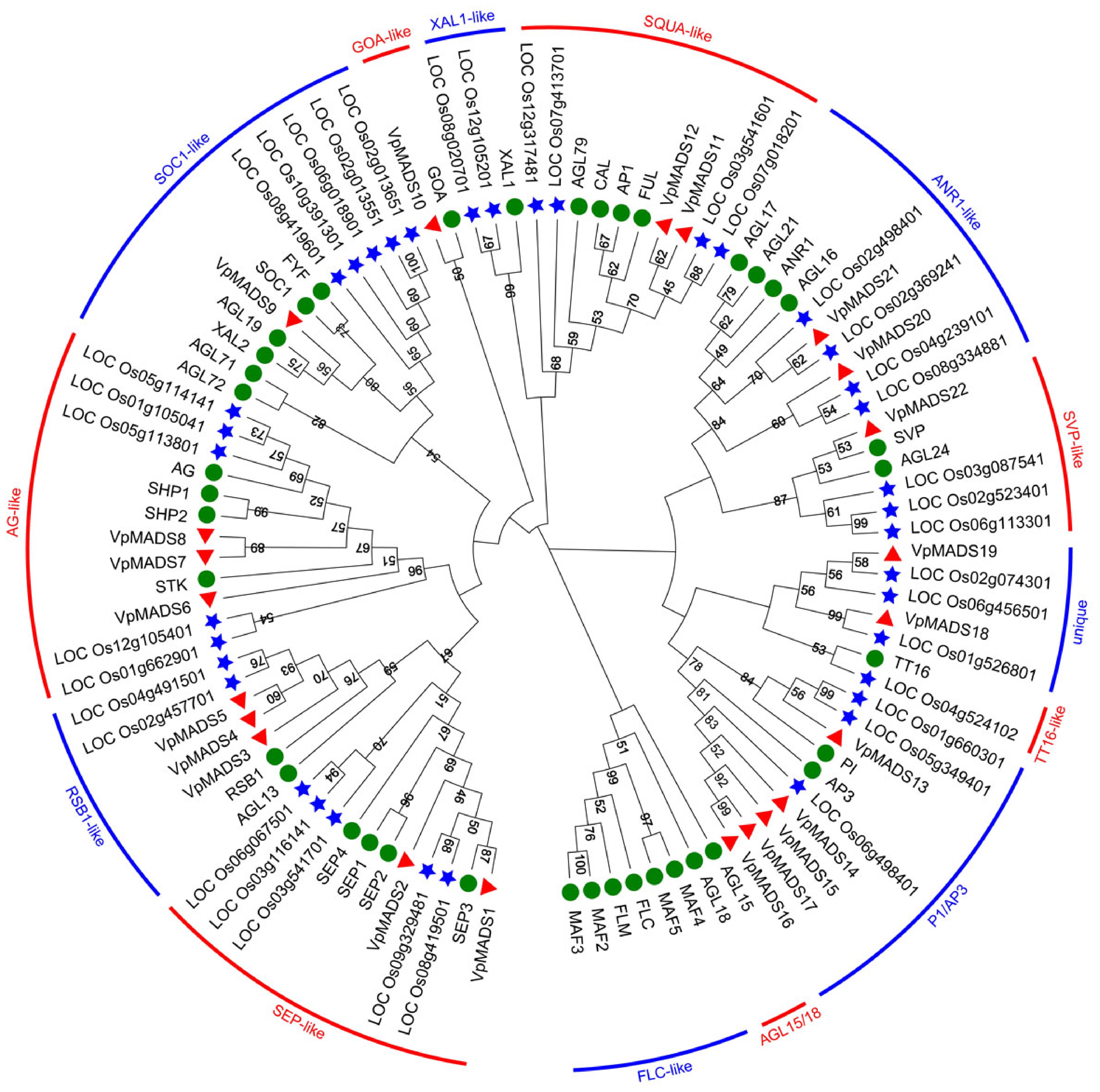 The phylogenetic tree of MIKCC-type MADS-box proteins in V. planifolia, A. thaliana, and O. sativa. The red triangles referred to VpMADSs, green circles referred to AtMADSs, and blue stars referred to OsMADSs. Two adjacent groups were alternately distinguished by bands of two colors.
