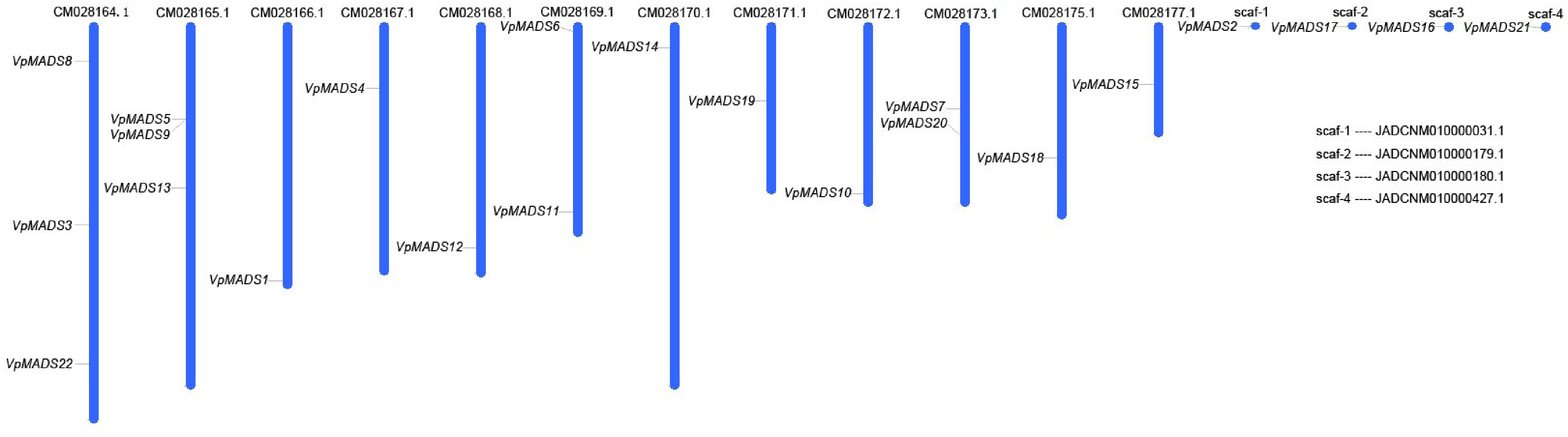 • Based on the results of 'HMMER' and 'BLASTP', a total of 47 MADS-box genes were identified. The chromosome locations, molecular weights, number of amino acids, exon numbers, pI, instability index, aliphatic index, GRAVY, and predicted subcellular locations are all presented in Table 1. As demonstrated in Table 1, the lengths of these MADS-box proteins ranged from 53 aa (KAG0449578.1) to 397 aa (KAG0468859.1). The molecular weights were between 6.09 kDa (KAG0449578.1), and 43.42 kDa (KAG0468859.1), and the pIs varied from 3.95 (KAG0468269.1) to 11.87 (KAG0500929.1), respectively. The instability indices were between 30.65 and 98.81 and six VpMADSs (VpMADS4, VpMADS5, VpMADS14, VpMADS15, VpMADS16, VpMADS17) were lower than 40. Nearly all VpMADSs exhibited negative GRAVY values, except for VpMADS21, suggesting that the majority of VpMADSs were hydrophilic, while VpMADS21 was hydrophobic (Table 1). It was predicted that nine MADS-box proteins might be expressed in the chloroplast, mitochondrion, and cytoplasm. In contrast, the other 38 members were predicted to be expressed in the nucleus (Table 1). Additionally, SMART results indicated that there were 22 genes belonging to the MIKCC type, which were named VpMADS1 to VpMADS22. Since the 'ABCDE' model is derived from MIKCC genes, we primarily concentrated on the MIKCC type genes in this study, and the subsequent analyses were also centered around this type.